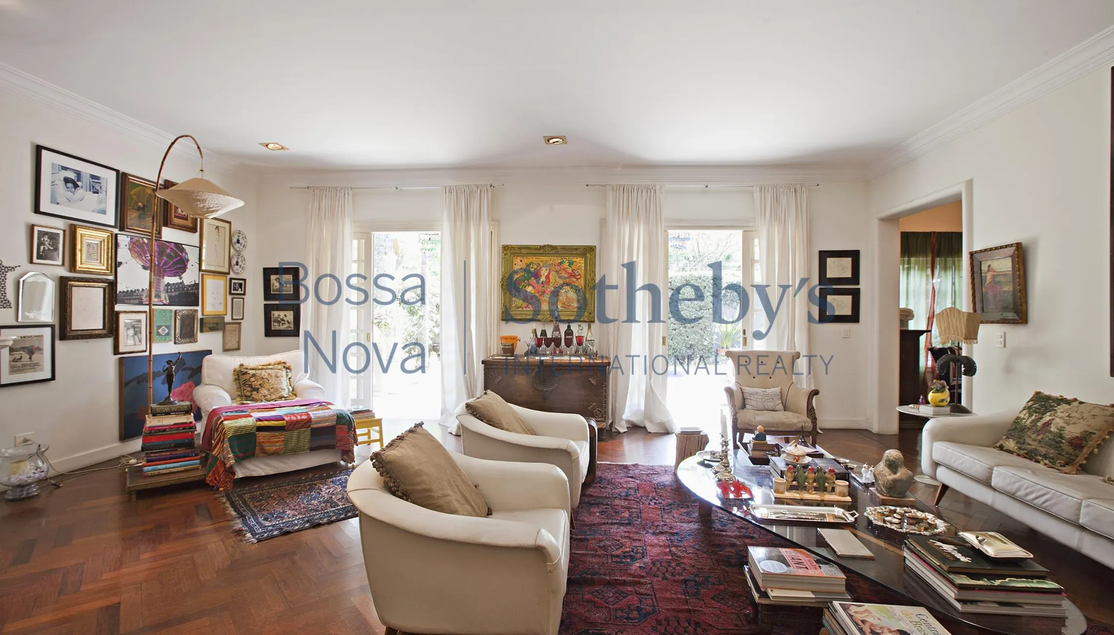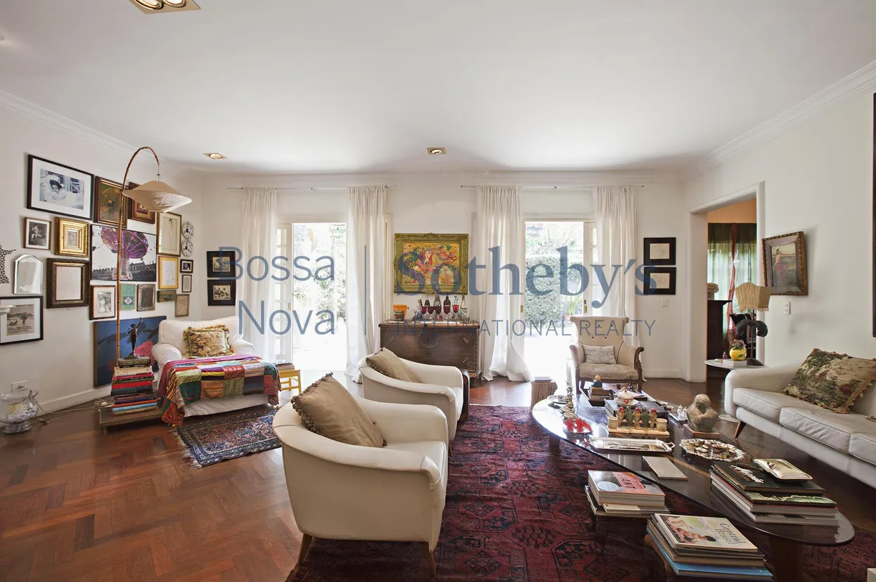 Casa com amplo living para vários ambientes, pisos e portas em madeira pintadas de branco, lareira, com ambientes voltados para jardim e piscina. No piso superior, um family room e 4 suítes, a master com closet e pé-direito alto. Piscina e solarium com vista do bairro. Possui alarme e sistema de segurança.