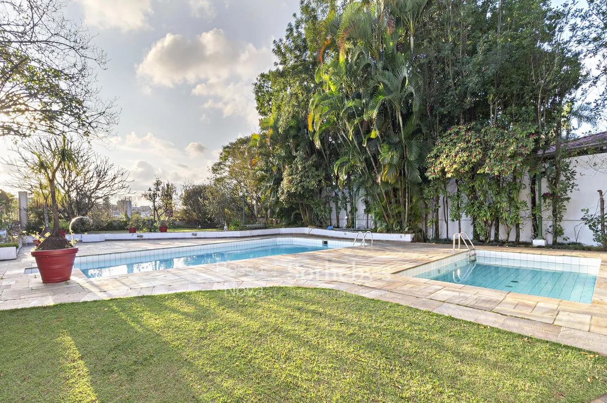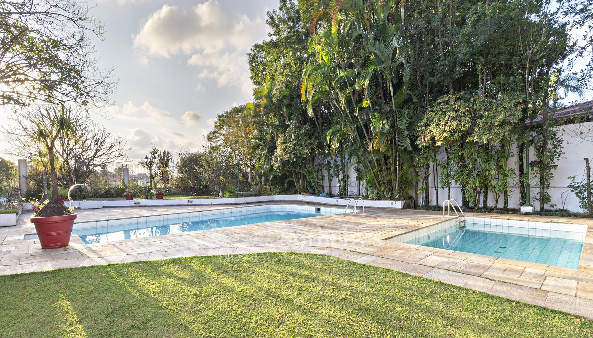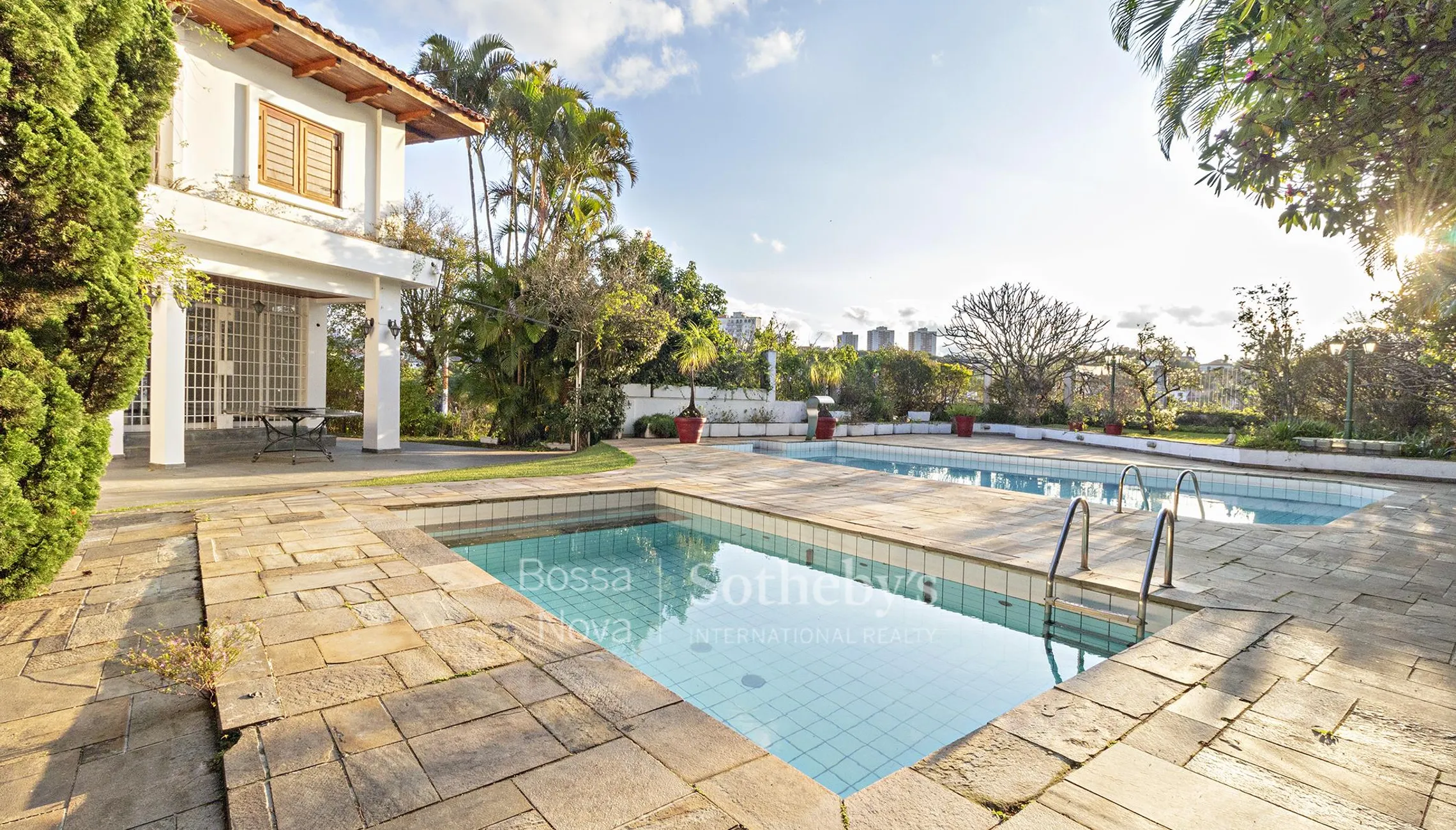 A casa é composta por seis salas, biblioteca com mobiliário próprio, duas lareiras, copa- cozinha repleta de armários, área de serviço bem constituída, contendo duas dependências de funcionária completas e área íntima com quatro suítes, closets, sete banheiros, lavabo e área de lazer completa com duas piscinas, sauna e quadra de squash.