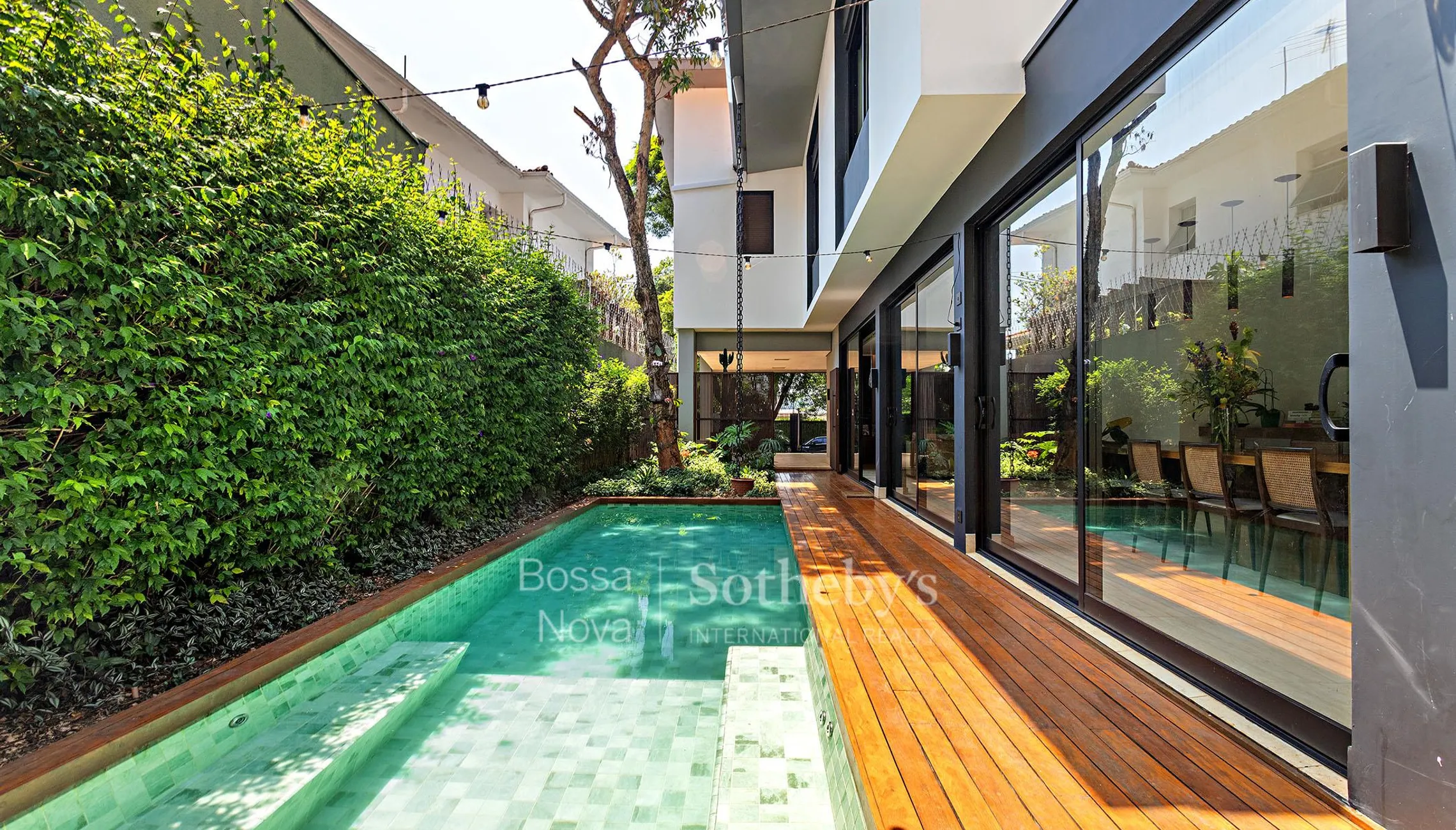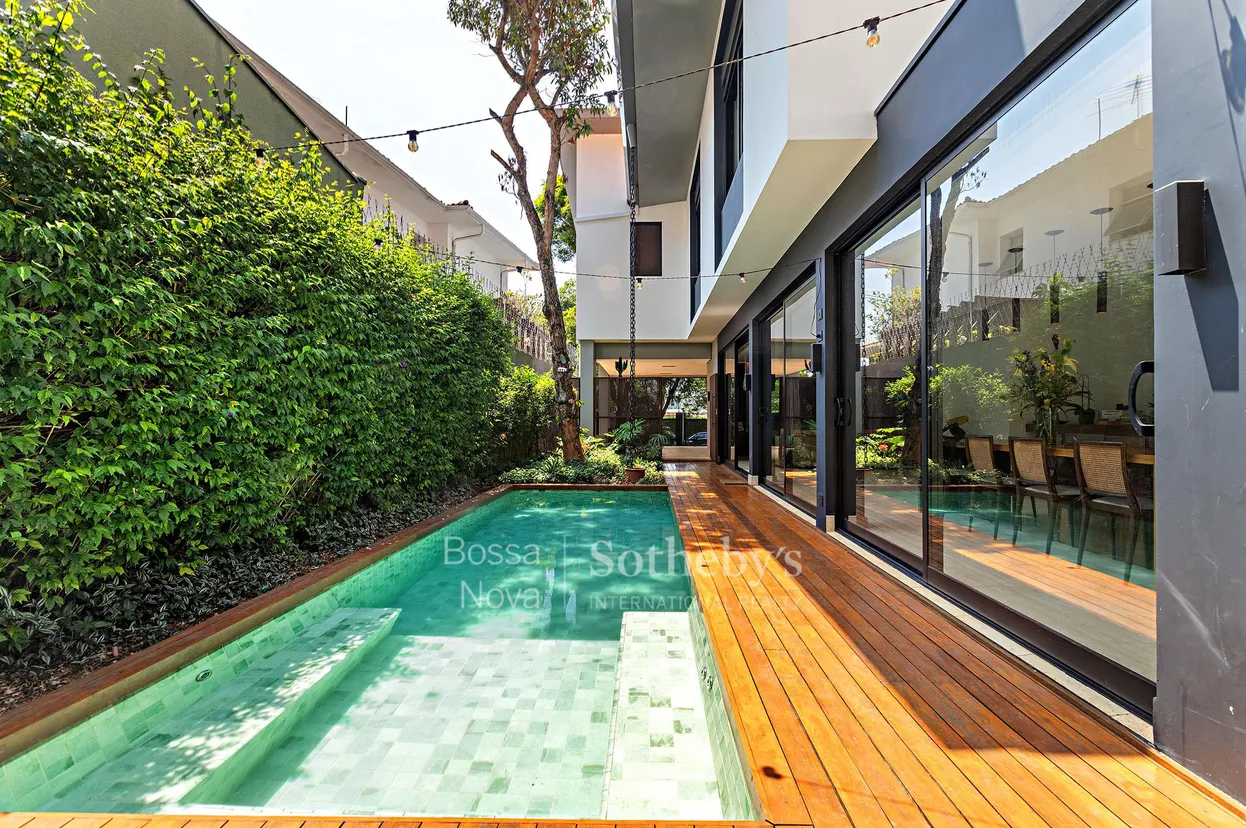 Renovada há cerca de dez anos, esta casa da década de 1960 combina elementos do projeto original com soluções contemporâneas que favorecem a integração entre os ambientes. A área social reúne sala de estar, jantar e TV em um único espaço voltado para o jardim, com portas de vidro que conectam os ambientes à piscina e ao espaço gourmet coberto. A escada original leva à área íntima, composta por uma suíte principal com closet duplo, banheiro com hidromassagem e varanda voltada para a copa das árvores, além de uma segunda suíte e um dormitório com banheiro social. A área externa conta com piscina aquecida com hidromassagem, jardim cuidado, edícula com área de serviço e ambiente voltado ao lazer infantil. A propriedade dispõe ainda de vagas para quatro veículos e canil.