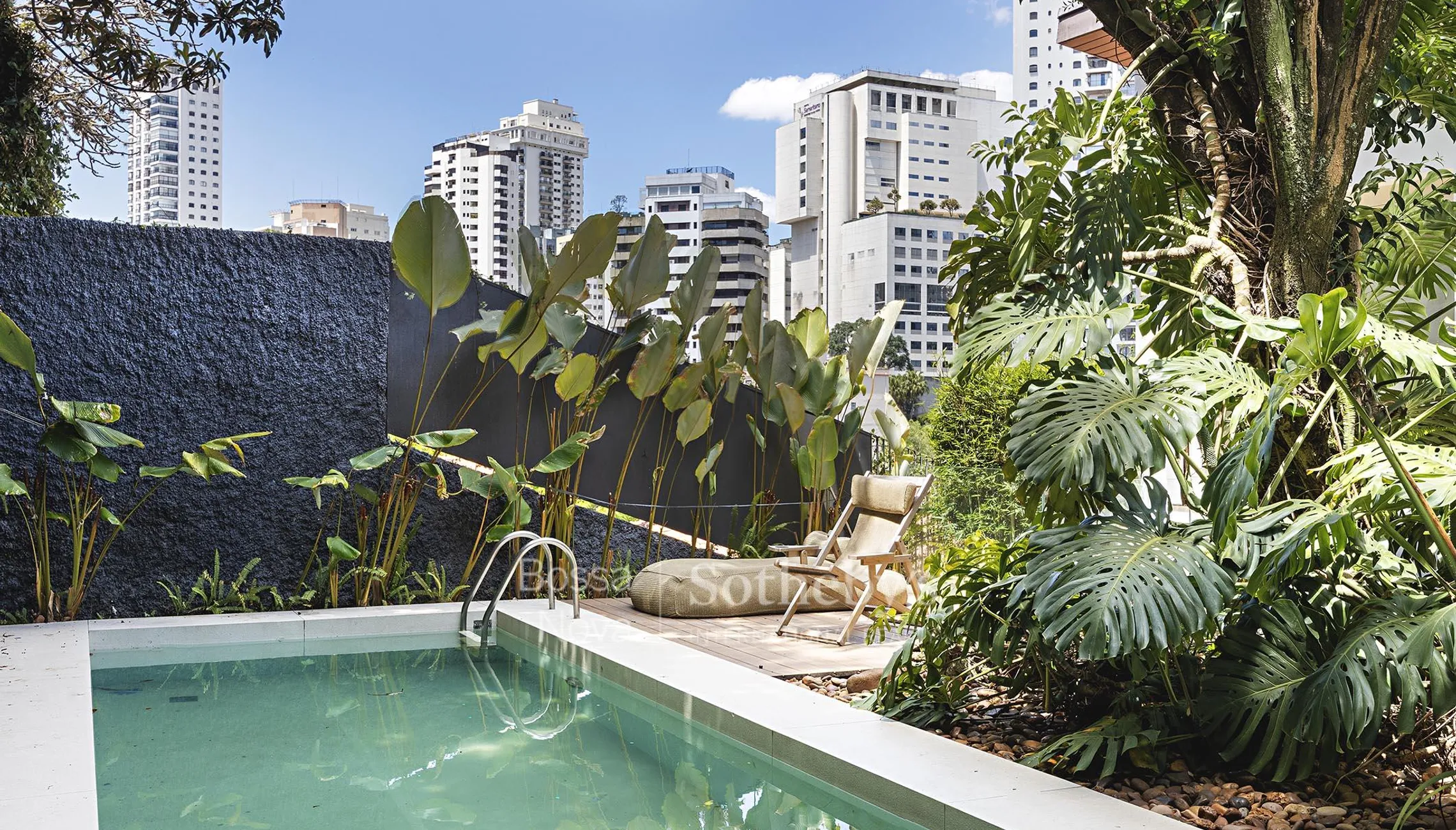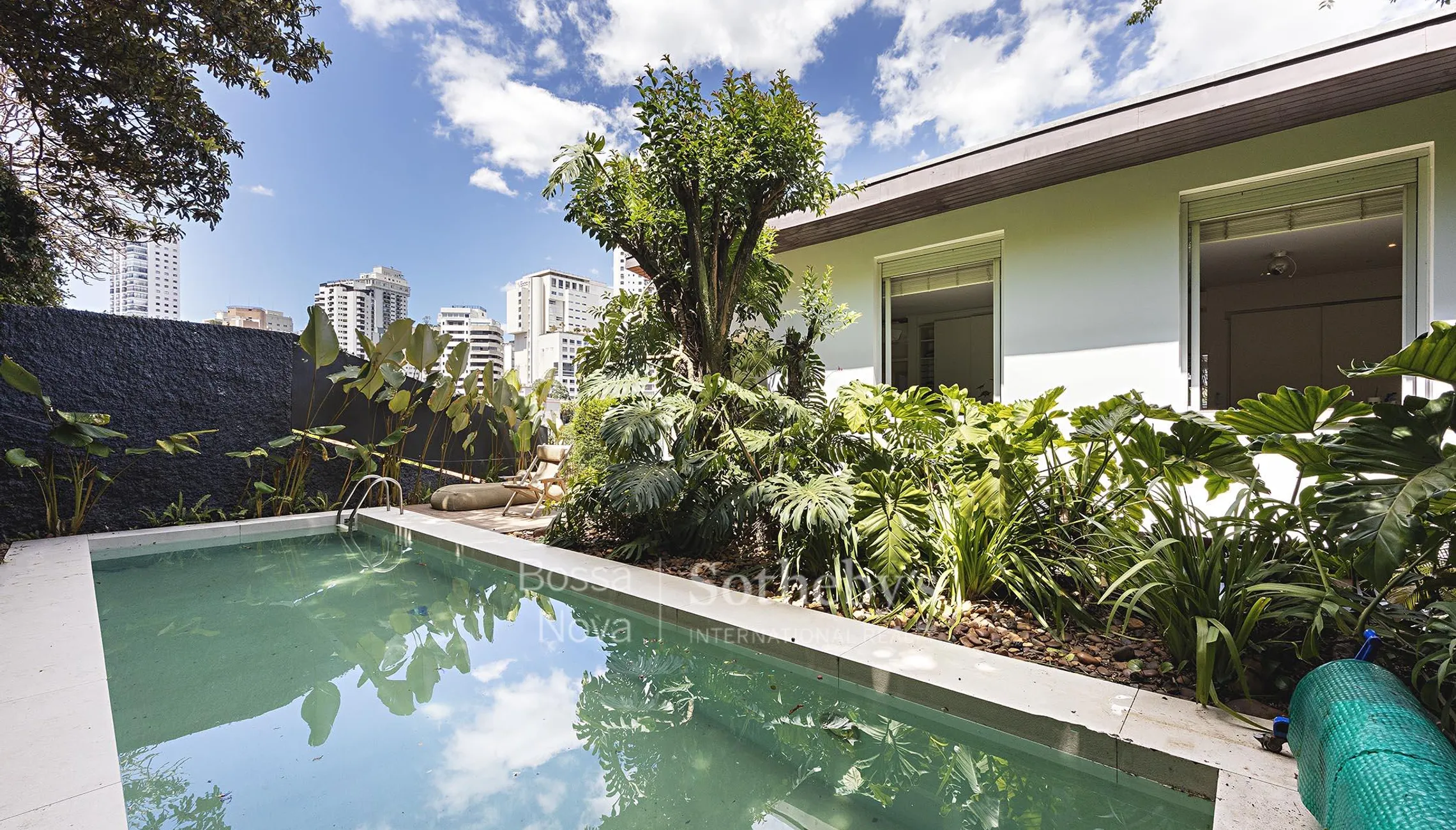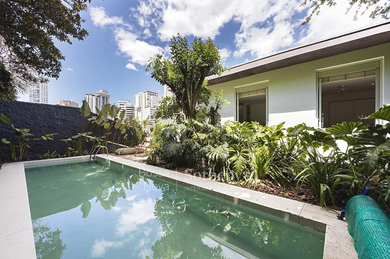 Localizada em uma rua estritamente residencial do Pacaembu, com acesso facilitado às comodidades de Higienópolis e Perdizes, esta residência modernista assinada por Vila Nova Artigas foi restaurada pelo arquiteto Arthur Casas, unindo sofisticação e autenticidade arquitetônica. A casa se destaca pelo generoso recuo frontal com paisagismo assinado, e fachada elevada sustentada por colunas. Possui duas entradas: uma por rampa com escada de pedras e outra entrada lateral para pedestres. O endereço conta com guarita e segurança 24 horas. São três pavimentos conectados por elevador original restaurado. No pavimento intermediário, o living integrado abriga ambientes de estar, jantar e TV, com lareira e janelas amplas que proporcionam iluminação natural e vista para Higienópolis. A sala de almoço se conecta à cozinha por uma abertura com bancada de mármore. A cozinha é equipada com marcenaria branca e eletrodomésticos embutidos. Ainda neste andar, há um lavabo revestido em mármore Carrara e área de serviço com despensa. A área externa conta com piscina aquecida em raia envolta por paisagismo com jabuticabeira, acessível tanto pelo living quanto pelo pavimento superior. No último andar, estão três dormitórios voltados para os fundos, sendo uma suíte com walk-in closet, banheira, ducha com vista e iluminação natural por claraboia. Há ainda dois dormitórios amplos, banheiro completo e rouparia no corredor. Um escritório com varanda e acesso direto ao deck da piscina complementa o pavimento. A casa conta com placas solares, ar-condicionado nos dormitórios e acabamentos como piso em taco-palito em toda a área íntima e social. Um exemplar de arquitetura modernista preservado, com toques contemporâneos que valorizam o conforto e o design.