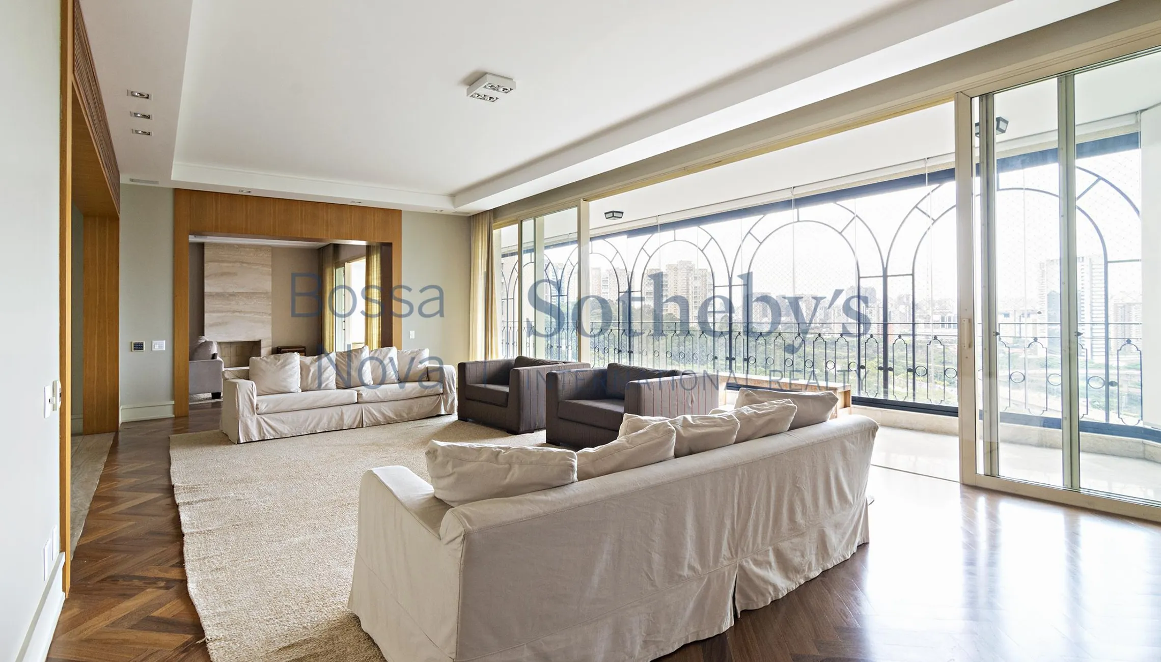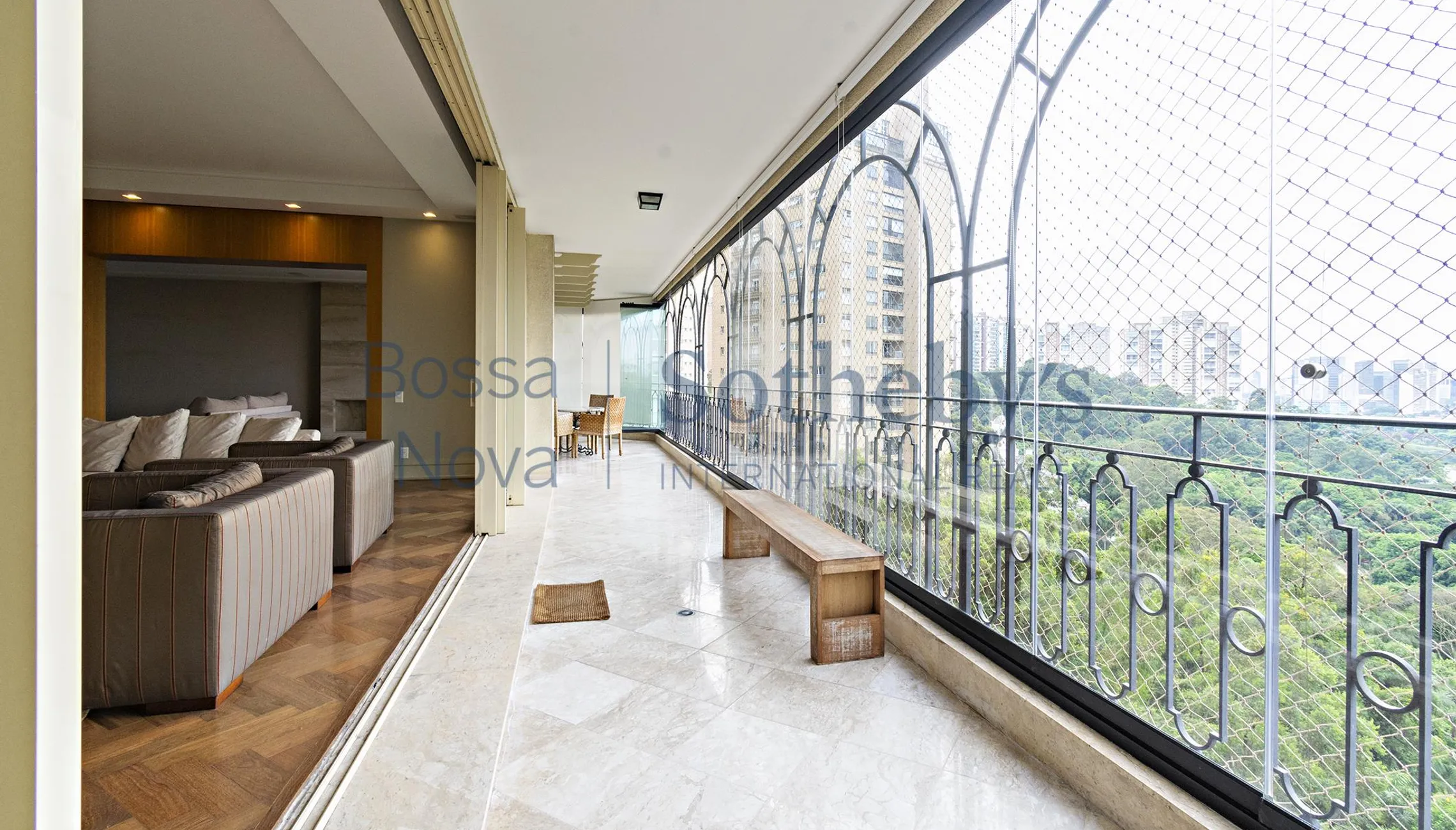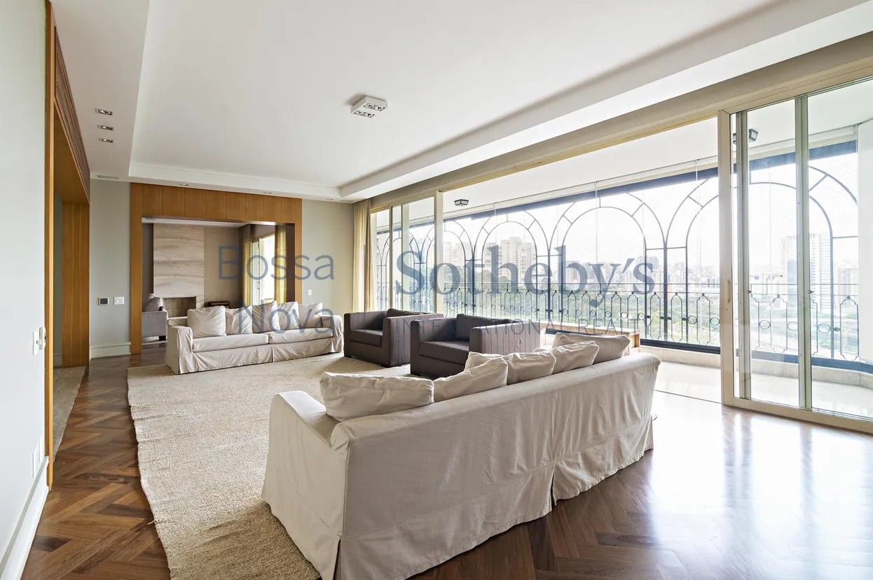 Apartamento com projeto de arquitetura de interiores do renomado Arquiteto Roberto Migotto. Possui amplo living com terraço e fechamento de vidros, ar-condicionado central e som ambiente, lavabo , cozinha e lavanderia com Marcenaria Kitchens e dois dormitórios de serviço. Na área íntima, dispõe de quatro suítes com marcenaria Ornare, tendo a suíte principal closet, banheiro Sr e Sra. Todos os dormitórios com janelas acústicas. Condomínio com academia, piscina coberta e aquecida, sauna seca e úmida.