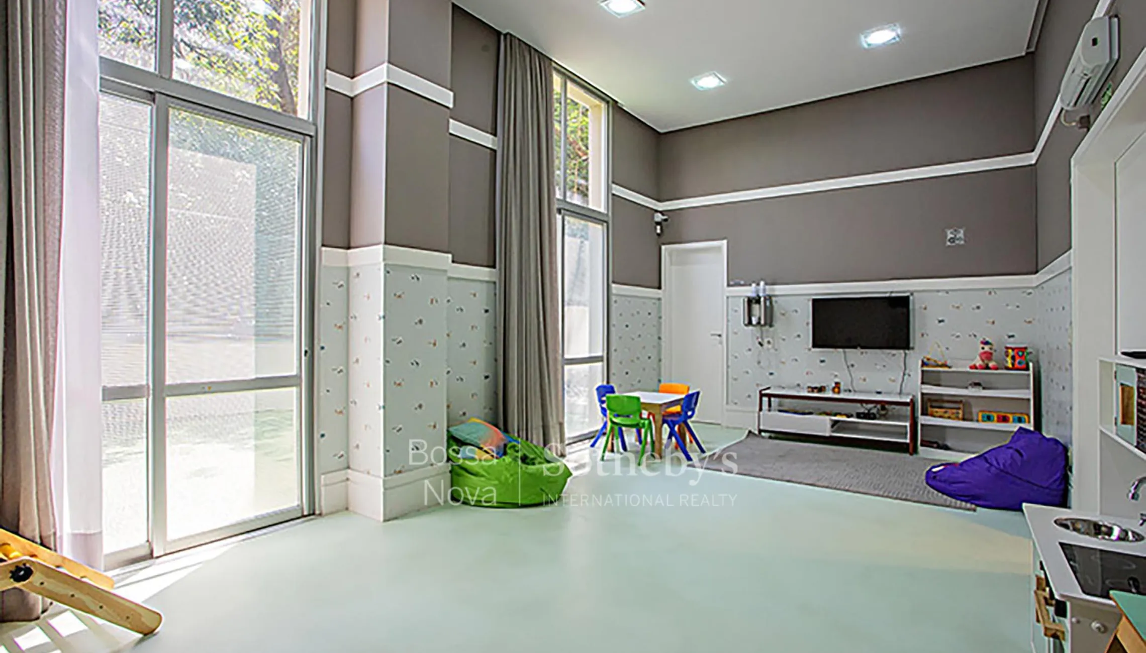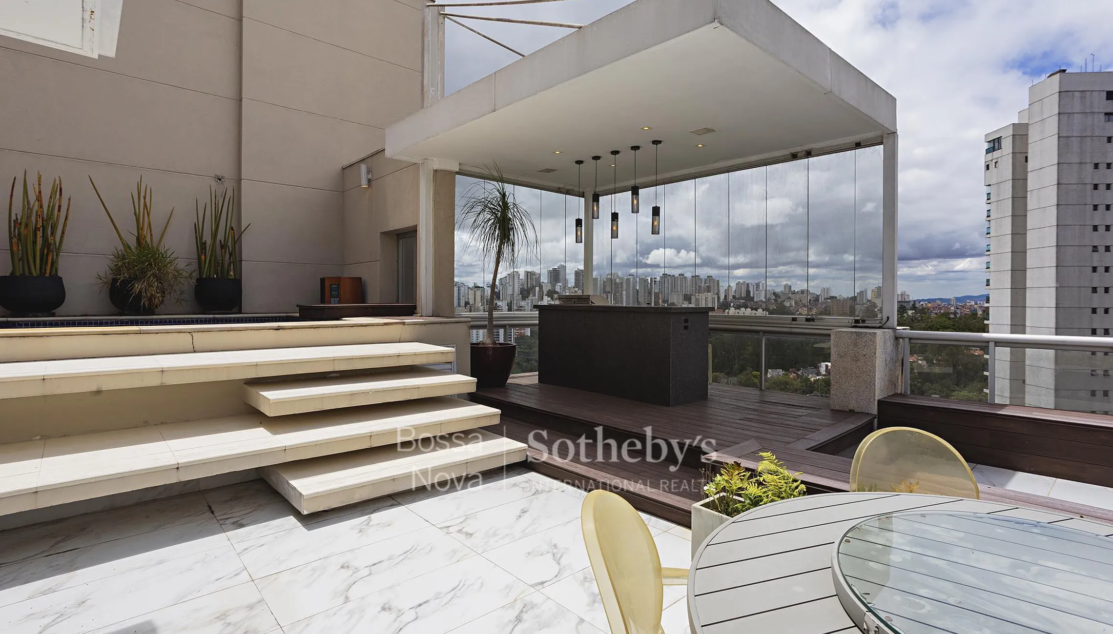 Cobertura duplex reformada por projeto arquitetônico que prioriza integração, funcionalidade e vista para a área verde do entorno. A área social reúne living, sala de jantar e terraço voltado para o parque, enquanto a planta oferece quatro suítes, sendo uma atualmente utilizada como sala adicional para ampliar os ambientes. A cozinha possui marcenaria planejada e está integrada às áreas de convivência. A cobertura dispõe de quatro vagas de garagem e conta com acesso a bosque privativo do condomínio, além de infraestrutura completa de lazer com quadras, piscina, academia e salão de festas. O condomínio oferece também portaria vinte e quatro horas e serviços que reforçam a praticidade no dia a dia. O imóvel pode ser negociado mobiliado.