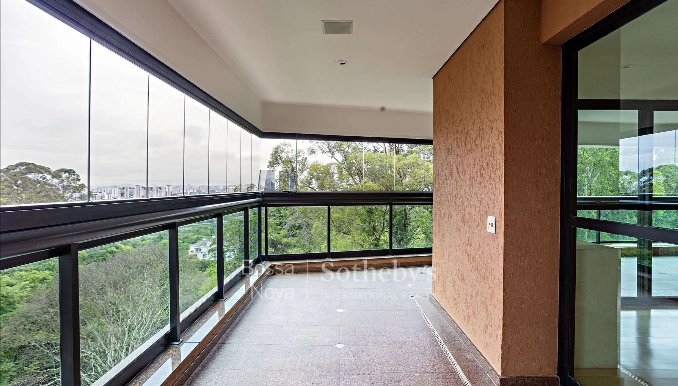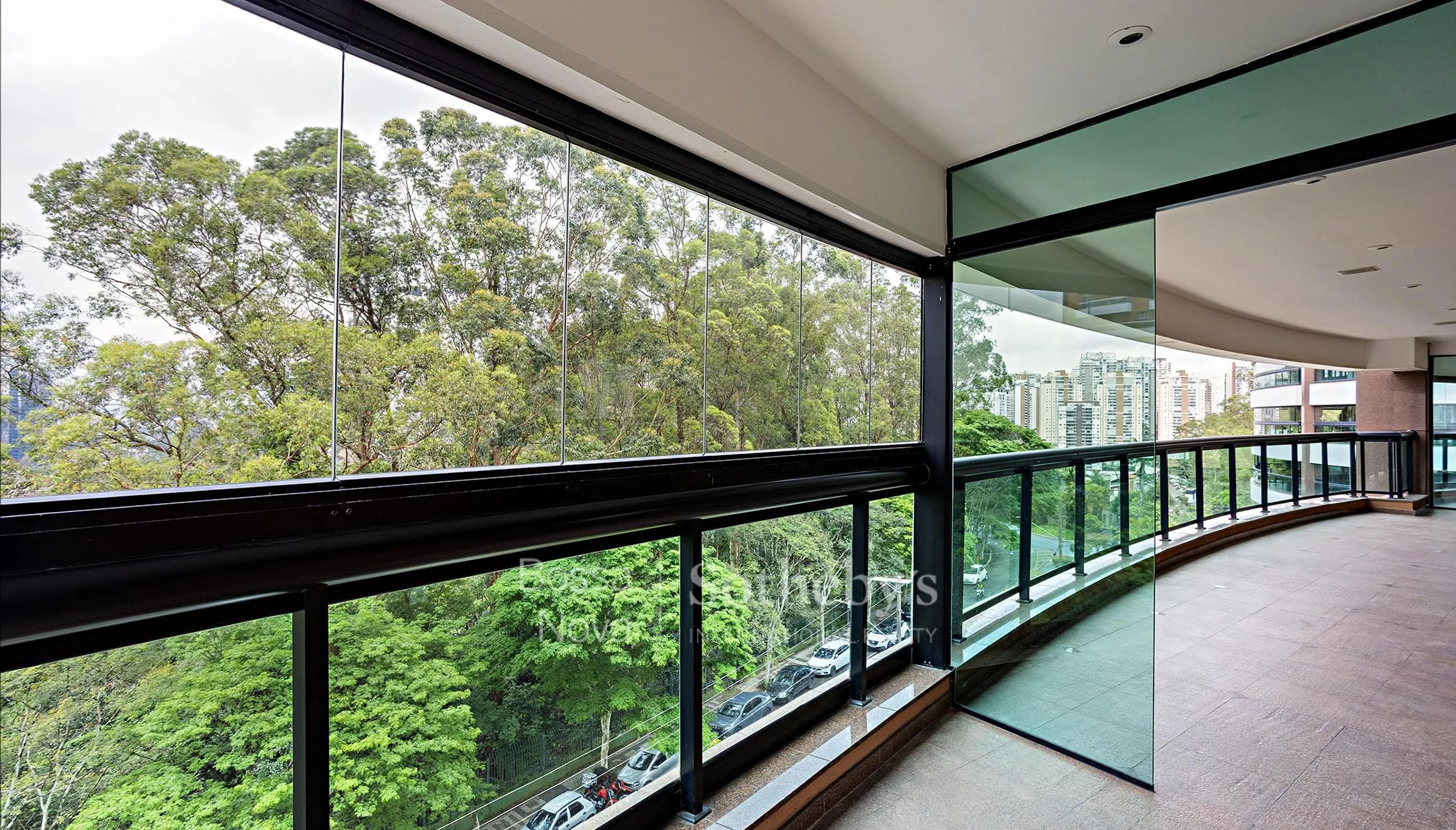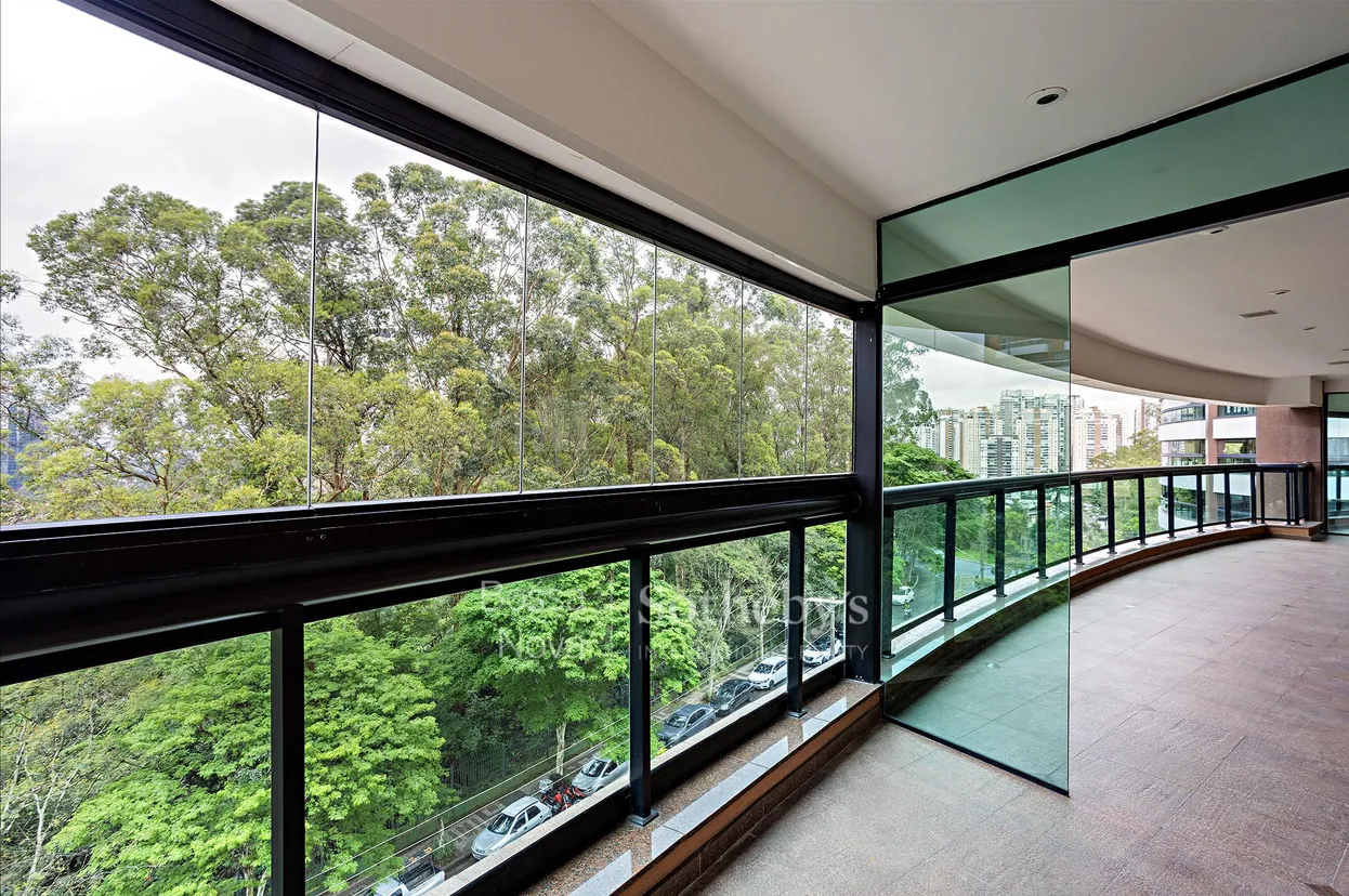 Apartamento com 385 m² de área útil e planta bem distribuída, situado em rua residencial da região do Panamby, com vista aberta para o Parque Burle Marx que combina paisagem panorâmica e copa das árvores. O projeto de interiores assinado por Arthur Mattos Casas organiza os ambientes de forma funcional. O living integra lareira, home theater com varanda incorporada e uma varanda que contorna a área social. Sala de jantar e sala de almoço se conectam à varanda equipada, favorecendo a continuidade entre os ambientes. A planta dispõe de quatro suítes, todas com armários desenvolvidos pelo escritório Arthur Casas, além de escritório planejado. O condomínio oferece infraestrutura com vagas para visitantes, segurança vinte e quatro horas, spa com sauna, piscina aquecida com raia, hidromassagem, sala de massagem e academia. Na área externa, há piscinas descobertas aquecidas, quadra de tênis, quadra poliesportiva, playground, espaço gourmet, salão de festas e salão de jogos.