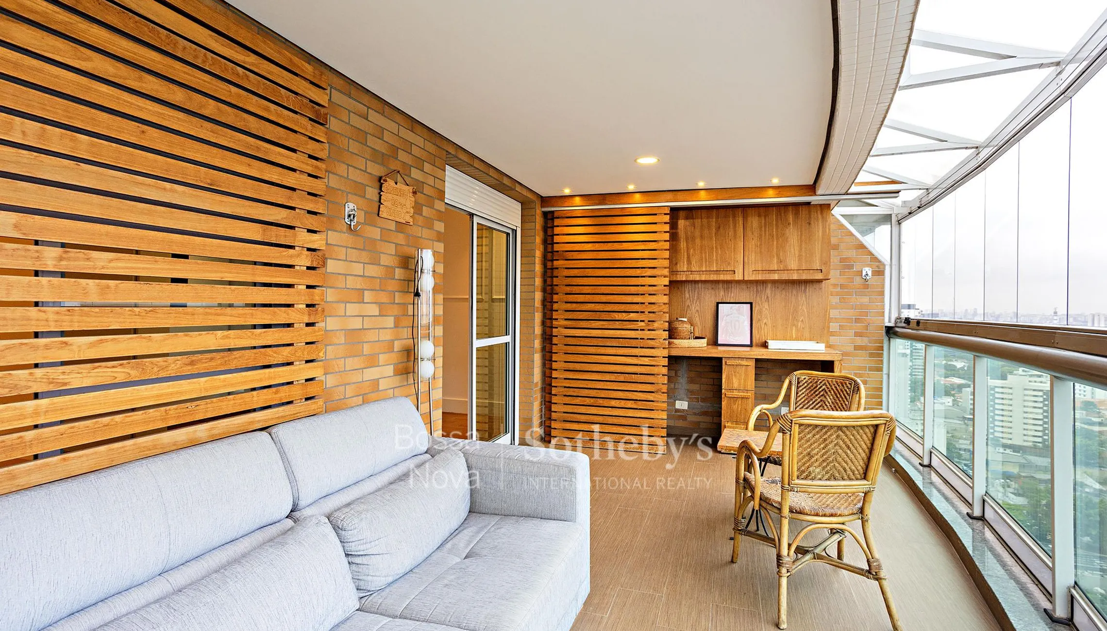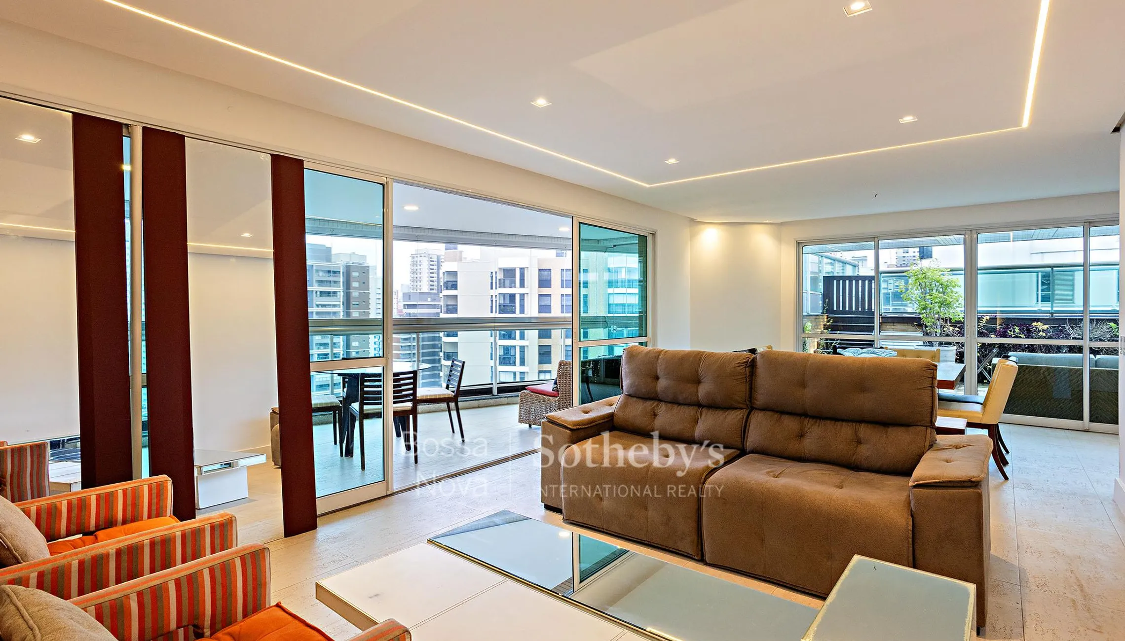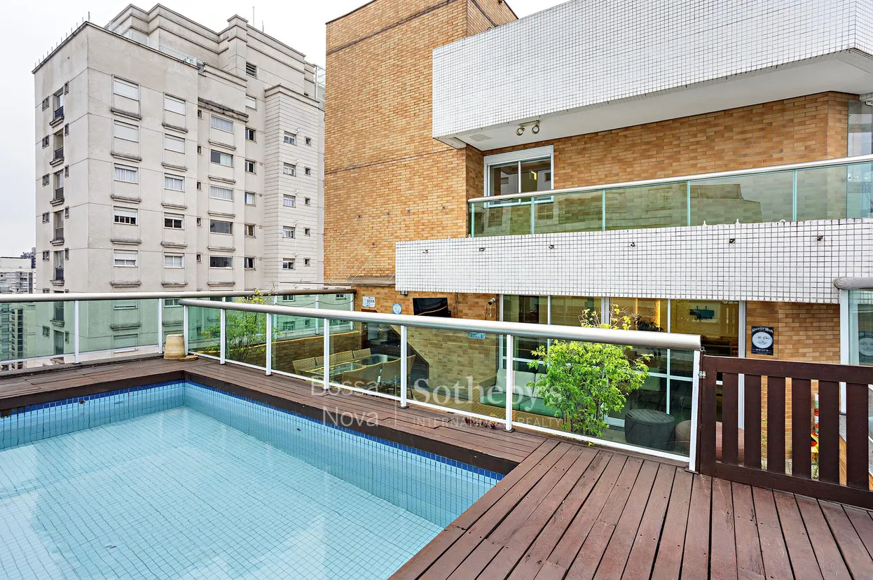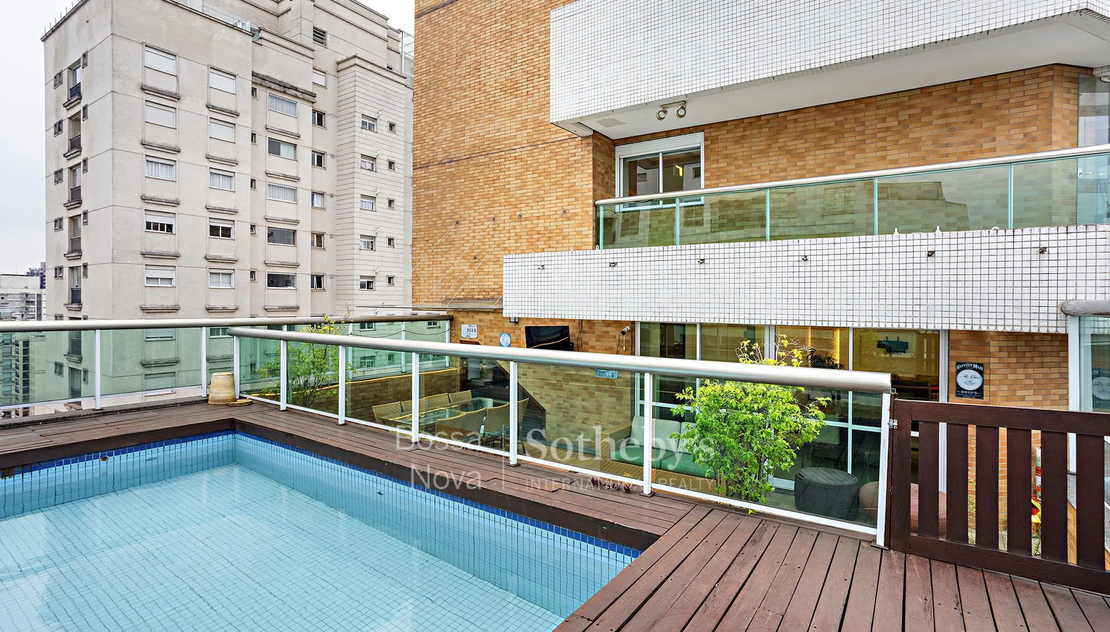 No piso superior estão as três suítes, todas com armários planejados e piso de taco. Duas delas contam com ar-condicionado, e a suíte principal se destaca pelo amplo espaço, closet, área para penteadeira e terraço generoso, ideal para um bar privativo ou um confortável espaço de trabalho. No piso inferior, o living para dois ambientes — estar e jantar — integra-se ao terraço gourmet e à área da piscina, profunda e ensolarada. O andar também abriga lavabo, cozinha planejada com ventilação natural e área de serviço no mesmo padrão, além de uma suíte para funcionários com ventilação natural. O edifício é contemporâneo, possui fachada elegante e oferece lazer completo com áreas de convivência bem cuidadas.