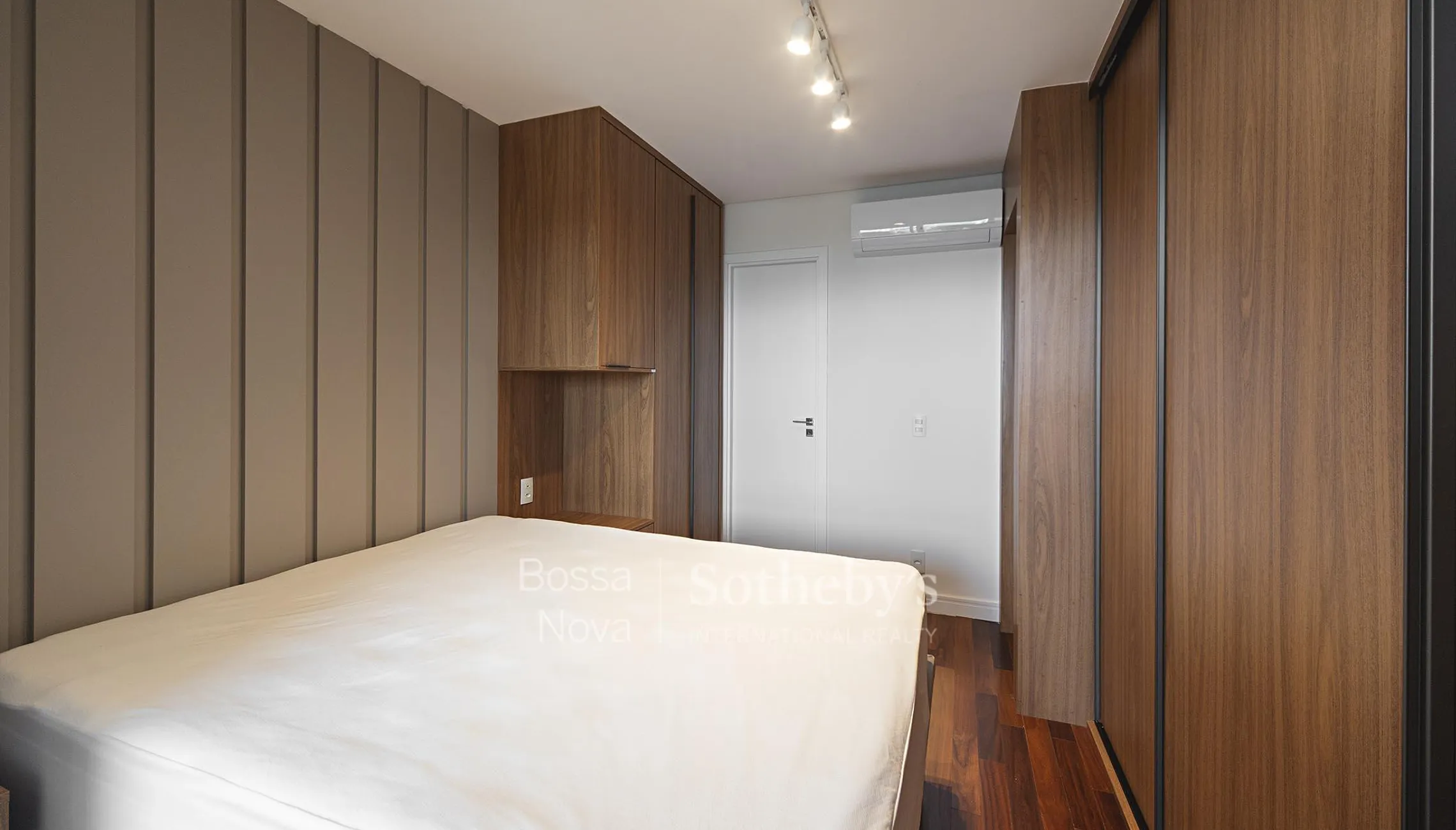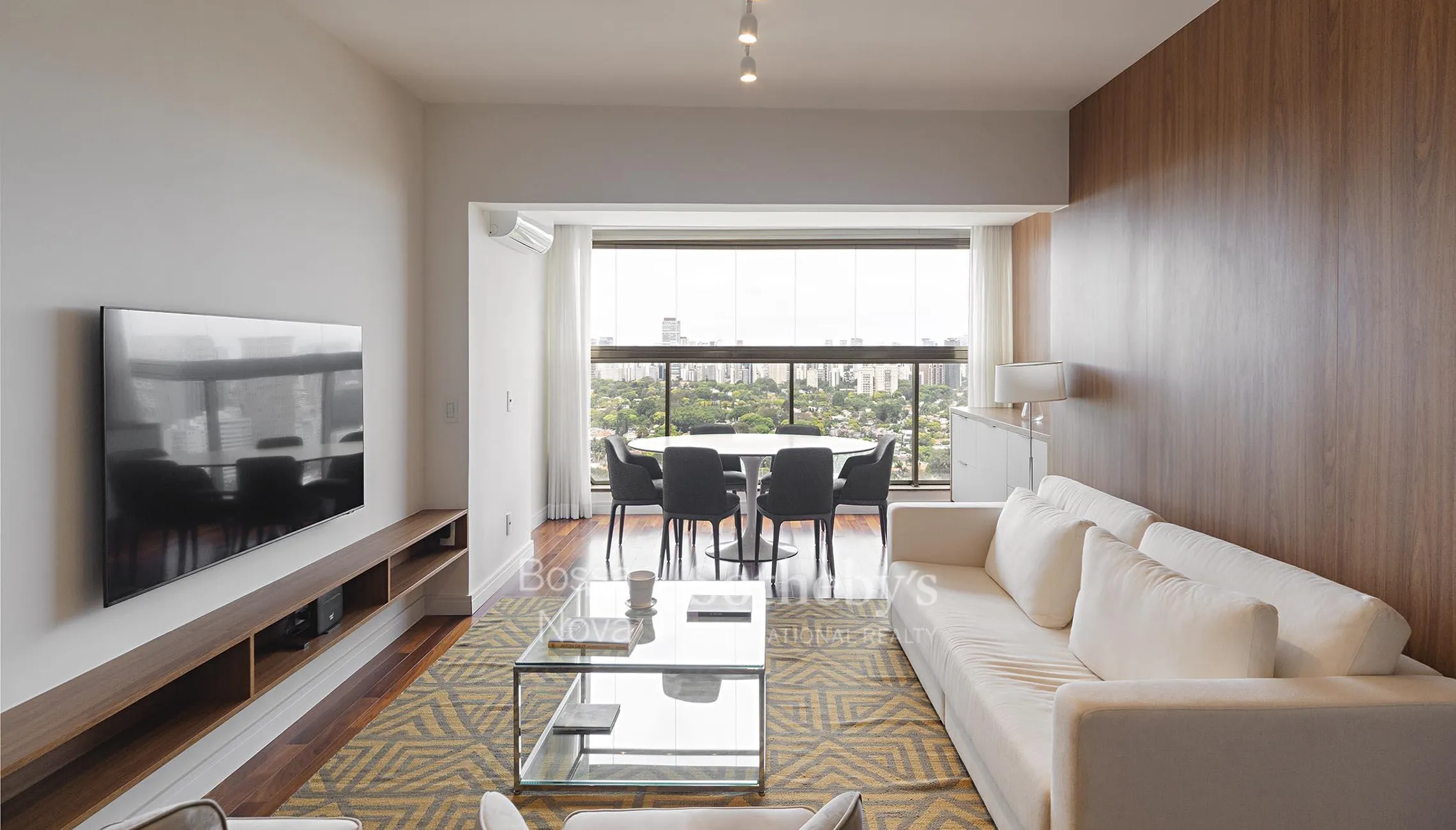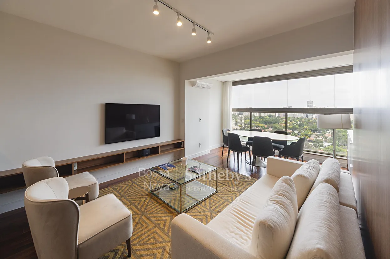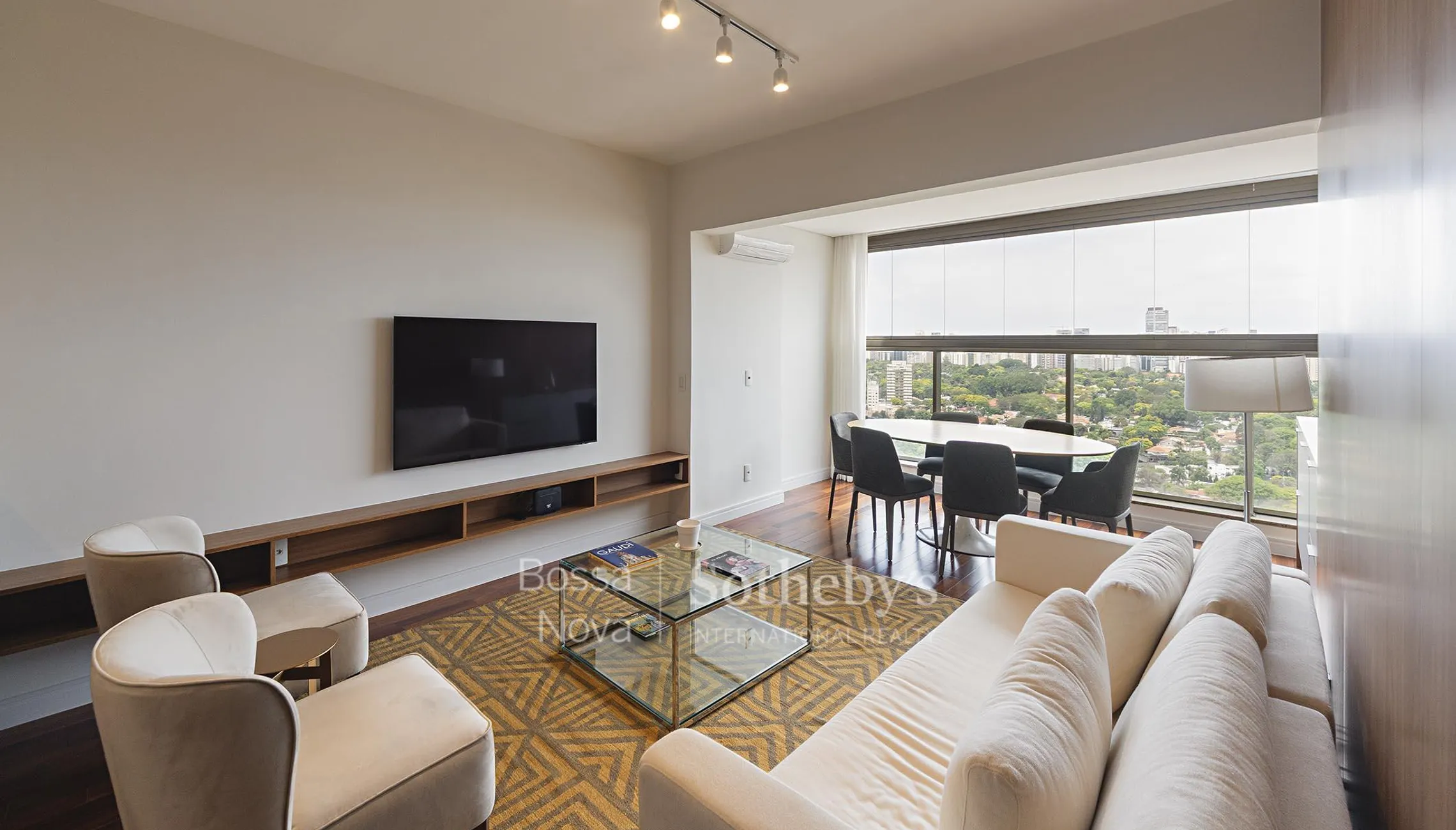 Este apartamento mobiliado apresenta um living espaçoso integrado à cozinha equipada, ideal para receber com conforto e praticidade. O espaço conta com armários planejados, ar-condicionado e projeto de iluminação refinado. Os acabamentos foram selecionados com materiais de alta qualidade, e a posição em andar alto garante excelente incidência de luz natural e vista aberta para o Jardim Europa. A área de lazer, localizada sobre a laje do embasamento, oferece piscina climatizada de borda infinita, solarium e academia equipada — projetada pela Cia Athletica — que proporciona ampla vista para o bairro de Pinheiros. No térreo, um salão de festas cercado por jardins foi concebido como ambiente reservado para convivência e celebrações.
