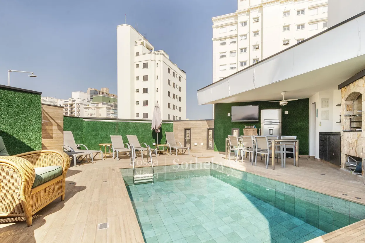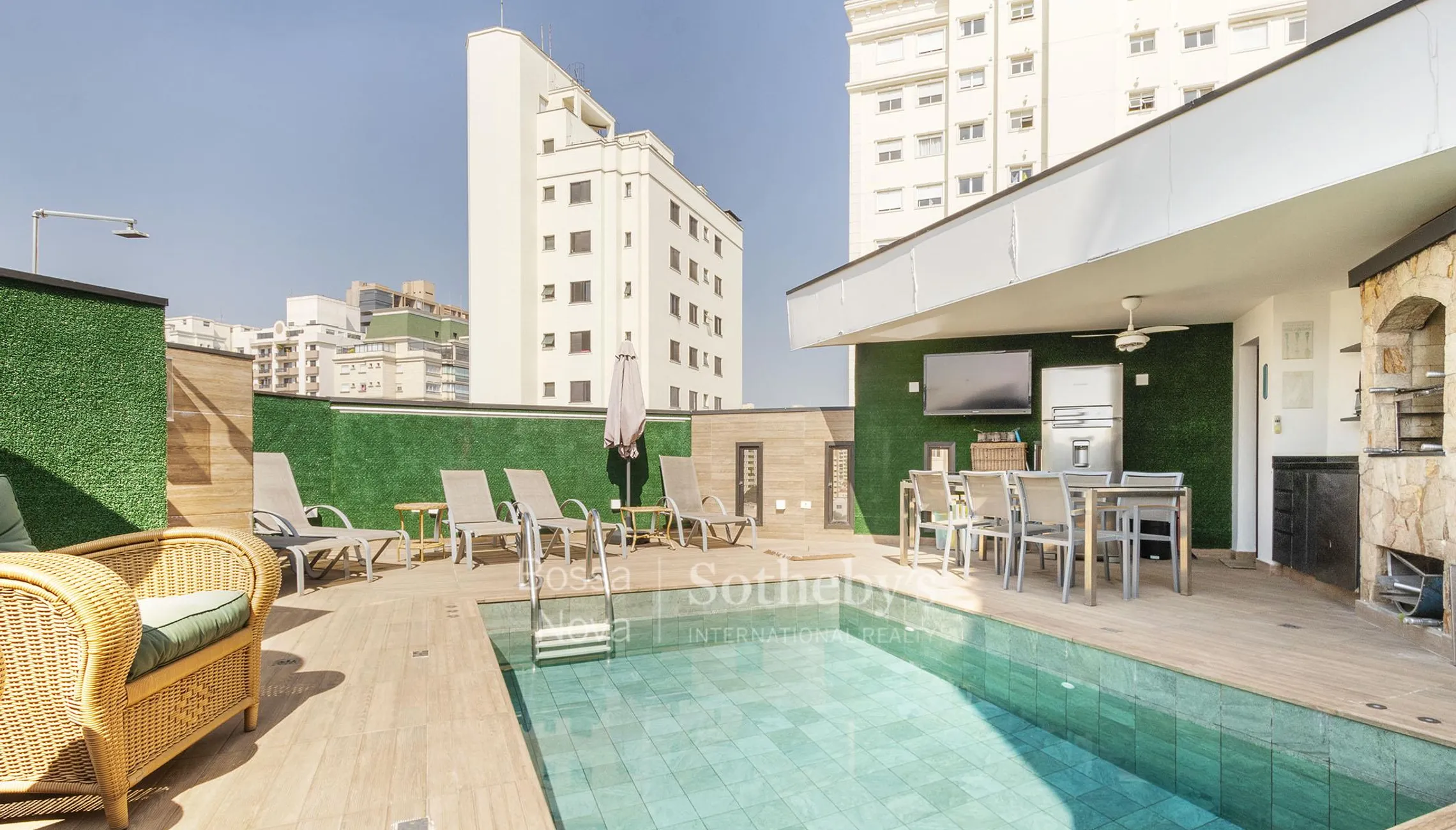 Cobertura com piscina, sauna e varanda gourmet com churrasqueira na Pompéia. O primeiro piso conta com living dividido em três ambientes, sendo eles sala de estar, sala de jantar e sala de TV, cozinha com balcão para refeições e armários planejados e área íntima com quatro suítes, sendo uma delas master com amplo banheiro e closet. No segundo piso encontra-se a área de varanda gourmet, com solarium, piscina aquecida, banheira de hidromassagem e sauna úmida. O condomínio oferece área de lazer com sala de ginástica, pilates, piscina e salão de festas.