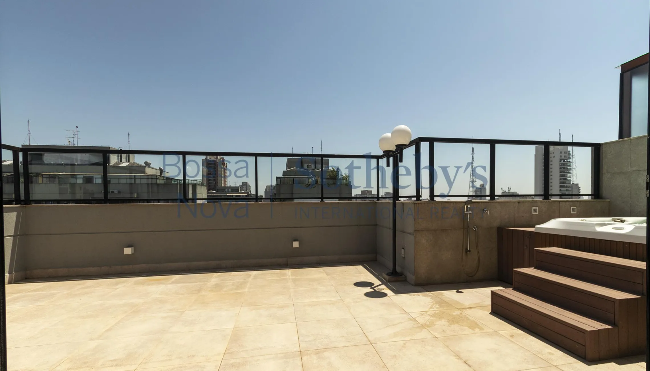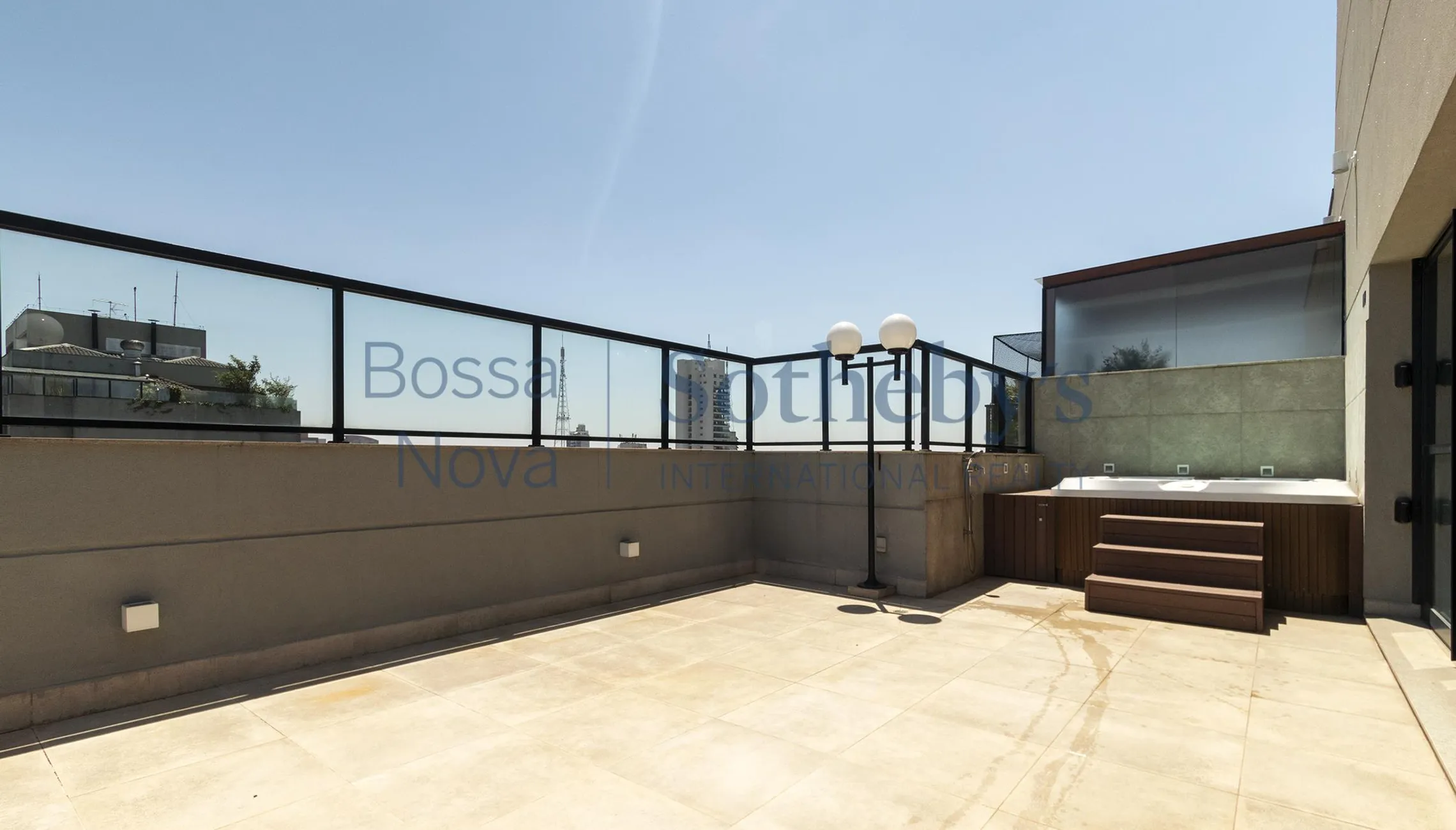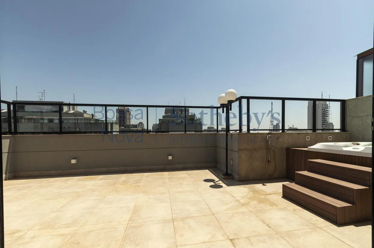 Esta cobertura duplex está localizada próxima à estação Vila Madalena do metrô, com fácil acesso à Avenida Paulista, e conta com elevadores que atendem os dois pavimentos, um diferencial importante de funcionalidade. No andar inferior estão quatro suítes com armários planejados e sala íntima com varanda envidraçada. O piso superior abriga living para três ambientes, cozinha equipada, terraço coberto com churrasqueira e área externa com jacuzzi, voltada para a vista aberta do bairro do Sumaré.