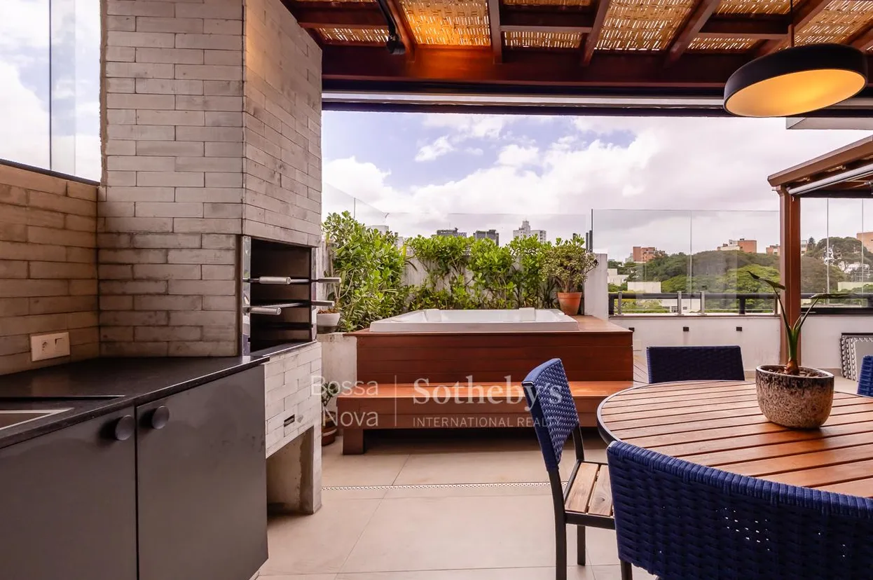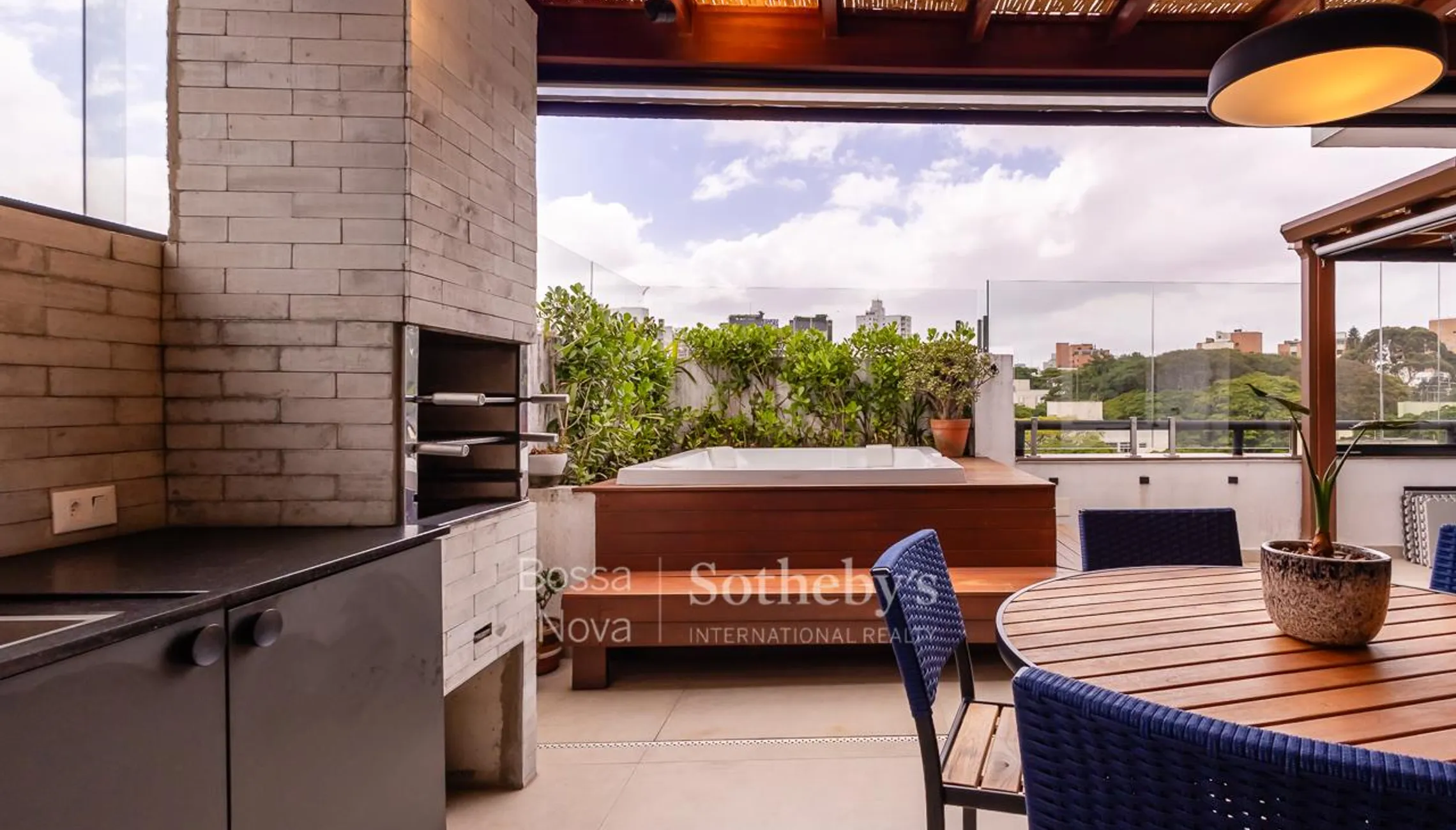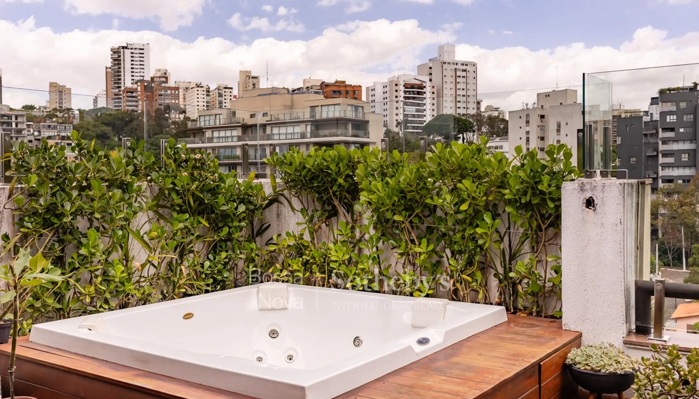 Esta cobertura duplex está localizada na Vila Madalena, com acesso a cafés, restaurantes, serviços e opções culturais. O projeto assinado por Vanessa Martinez organiza os ambientes de forma integrada, favorecendo a circulação e a iluminação natural. No piso inferior, a área íntima reúne três dormitórios, incluindo a suíte principal com closet planejado e banheiro com dois chuveiros, duas pias e sanitário reservado, além de climatização nos ambientes. No piso superior, a área social integra cozinha, espaço gourmet e sala de TV com projetor e tela automatizados, enquanto o fechamento com toldo elétrico amplia o uso do espaço. A área externa dispõe de jacuzzi com hidromassagem. O imóvel passou por reforma completa em dois mil e vinte e dois, incluindo elétrica, hidráulica e impermeabilização, e conta ainda com aquecimento a gás com controle remoto, sistema de câmeras internas, água quente em todas as torneiras e climatização nos dormitórios. A venda é com porteira fechada. O condomínio oferece salão de festas e piscinas adulto e infantil, e a unidade dispõe de duas vagas cobertas.