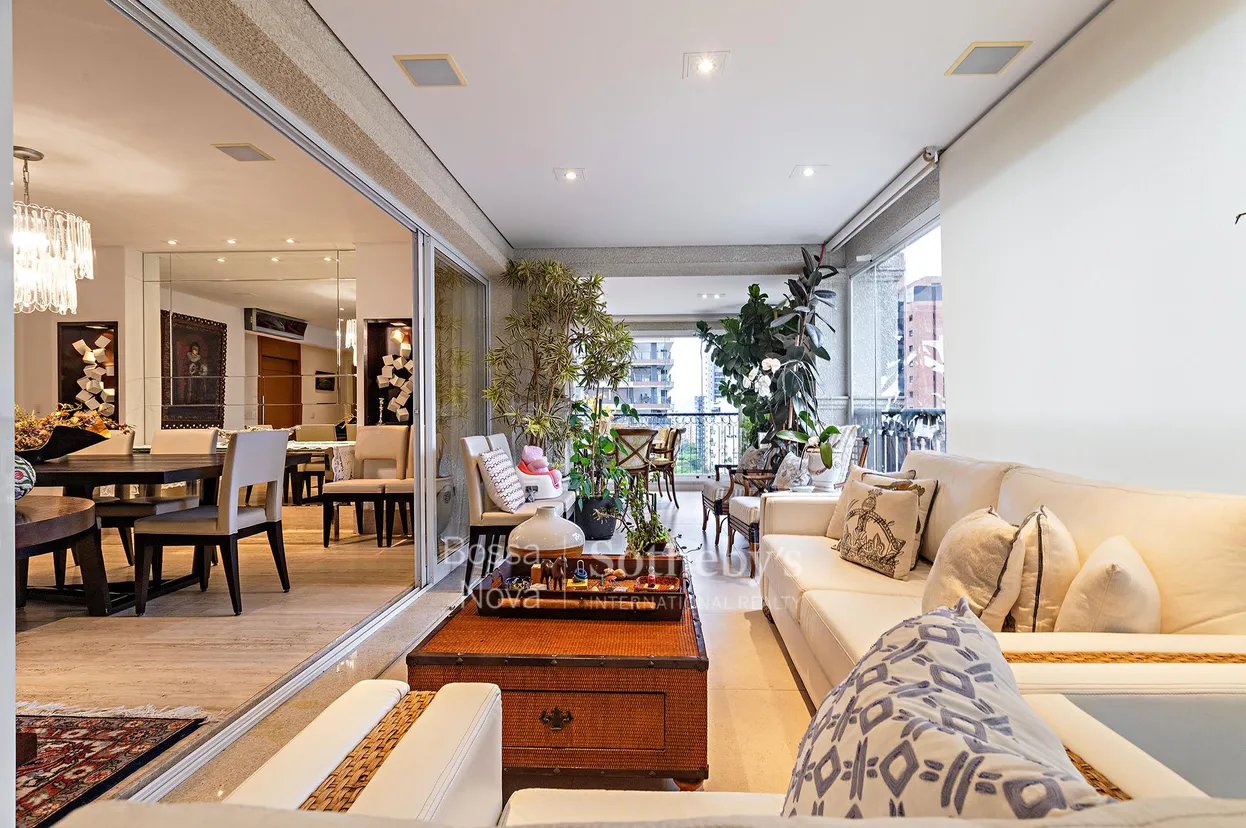 Localizado nas proximidades do Parque Ibirapuera, este apartamento oferece área social composta por terraço em L com espaço gourmet e churrasqueira, além de salas integradas de jantar, estar e home theater, todas com automação e climatização por ar-condicionado. A planta atual conta com três suítes, sendo a principal equipada com terraço privativo que pode ser utilizado como escritório, banheiro Sr. e Sra. com banheira de hidromassagem e closet, todos com marcenaria Ornare. Os dormitórios também são climatizados e há possibilidade de adaptação para uma quarta suíte. A cozinha é espaçosa e conectada à área gourmet interna, mantendo integração entre os ambientes. O imóvel dispõe de cinco vagas de garagem, sendo uma delas tipo box, além de depósito privativo. O edifício conta com gerador full atendendo todos os apartamentos e segurança reforçada 24 horas, com guarita blindada e controle de acesso. A localização é estratégica, com fácil acesso aos comércios e serviços da região.
