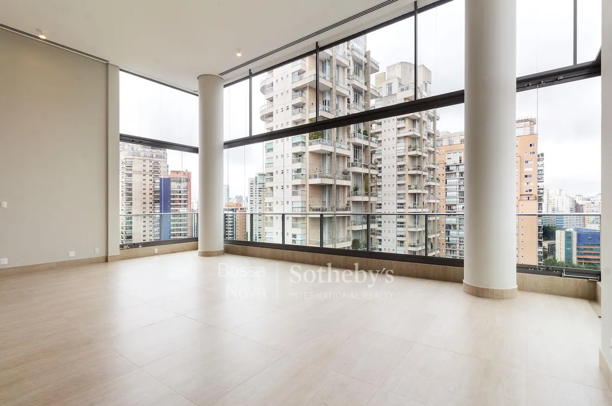 Cobertura duplex na Vila Nova Conceição, em prédio novo projetado pelo arquiteto Itamar Beresin. Os ambientes são iluminados e contam com acabamentos refinados e de alto padrão. Apresenta varanda integrada ao living com pé-direito duplo, proporcionando uma vista privilegiada da cidade, além de sala de almoço, home theater e área gourmet. Ainda nesse piso, encontram-se a cozinha com armários planejados Kitchens e uma generosa área de serviço. A área íntima, no andar superior, é constituída de quatro suítes, sendo a master com mais de 50 metros quadrados, varanda ampla, banheiro Sr. e Sra. e walk-in closet. Há, ainda, pequena copa nesse andar. A unidade dispõe de quatro vagas, sendo uma com carregador para carro elétrico. O lazer do prédio é composto de uma piscina com raia de 22 metros, academia e salão de festas.