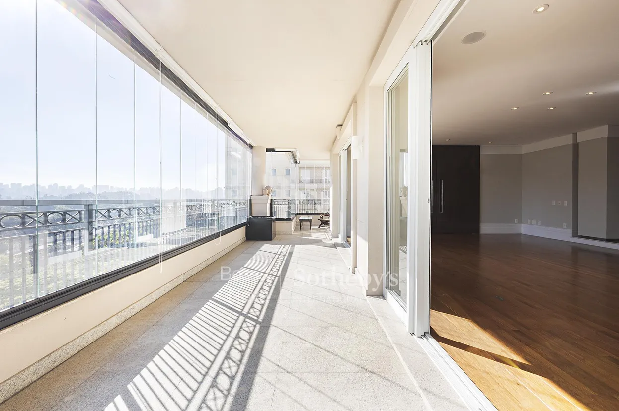 Este apartamento está localizado em frente ao Parque Ibirapuera, com vista aberta para a vegetação do Jardim Lusitânia e para o horizonte urbano de São Paulo. A planta oferece living amplo para estar, jantar e home theater, além de sala de almoço, sala íntima e escritório. A suíte principal conta com dois terraços, walk-in closet para dois ambientes e banheiros revestidos em mármore pigues. As demais suítes são equipadas com armários Ornare e a cozinha, com marcenaria Kitchens. O edifício apresenta arquitetura em estilo neoclássico com recuo, guarita blindada, sistema de segurança 24 horas e áreas comuns com piscina, academia, pilates, sauna e spa. A localização oferece acesso direto ao parque e está próxima a centros culturais, serviços e restaurantes da região.