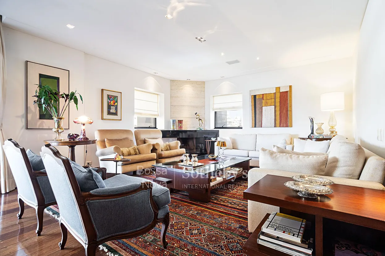 Apartamento clássico na Vila Nova Conceição, próximo a todas as comodidades do bairro e a poucas quadras do Parque do Ibirapuera. Tem uma planta bem-distribuída, composta de living amplo para quatro ambientes circundados por um terraço, sala de jantar e sala de almoço, lavabo, hall de distribuição e corredor para a área de serviço. Na área íntima há quatro suítes, sendo a master com closet e espaçoso banheiro com banheira. O lazer do condomínio conta com academia, salão de festas, piscina e playground. A unidade dispõe de cinco vagas de garagem.