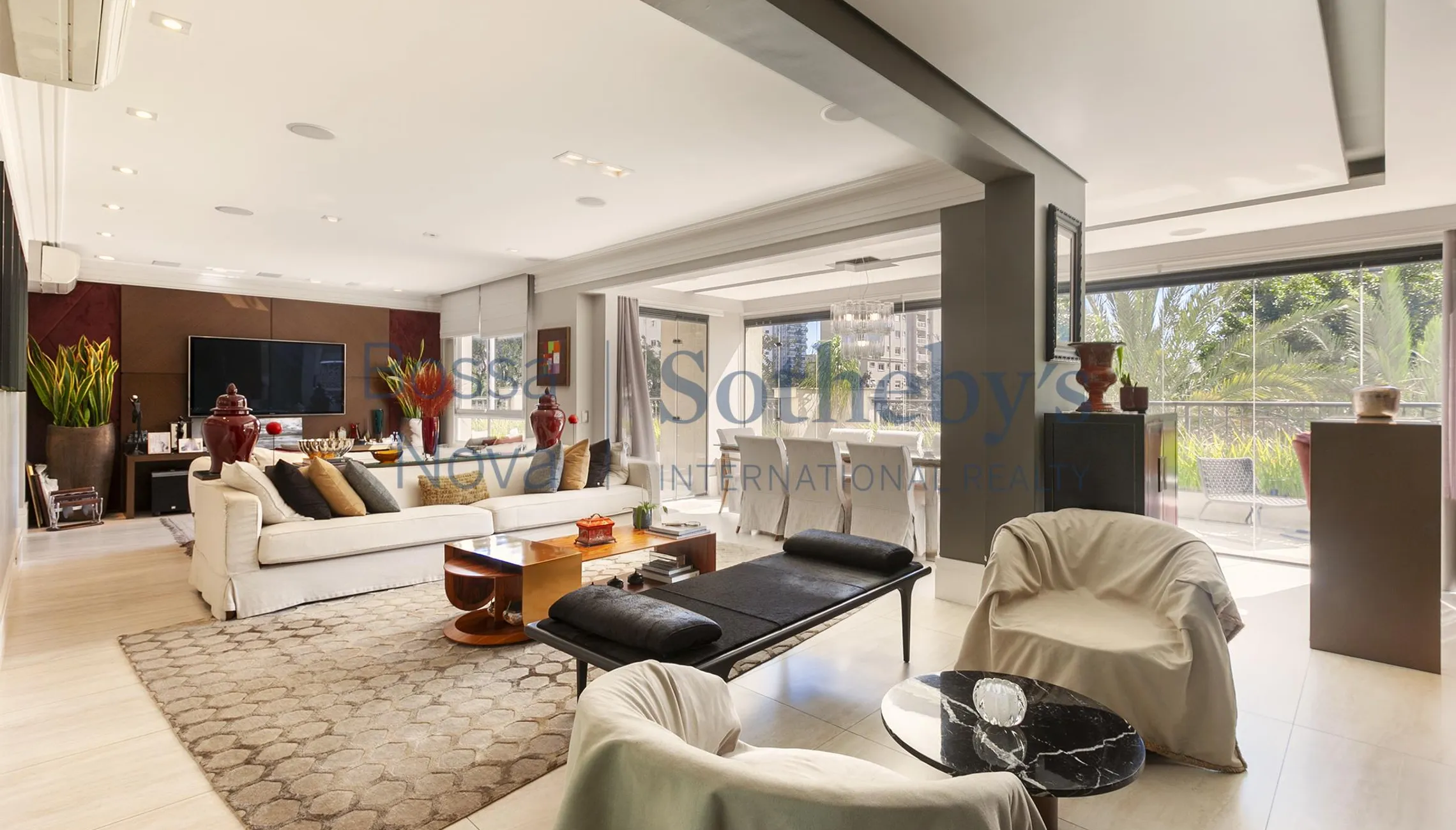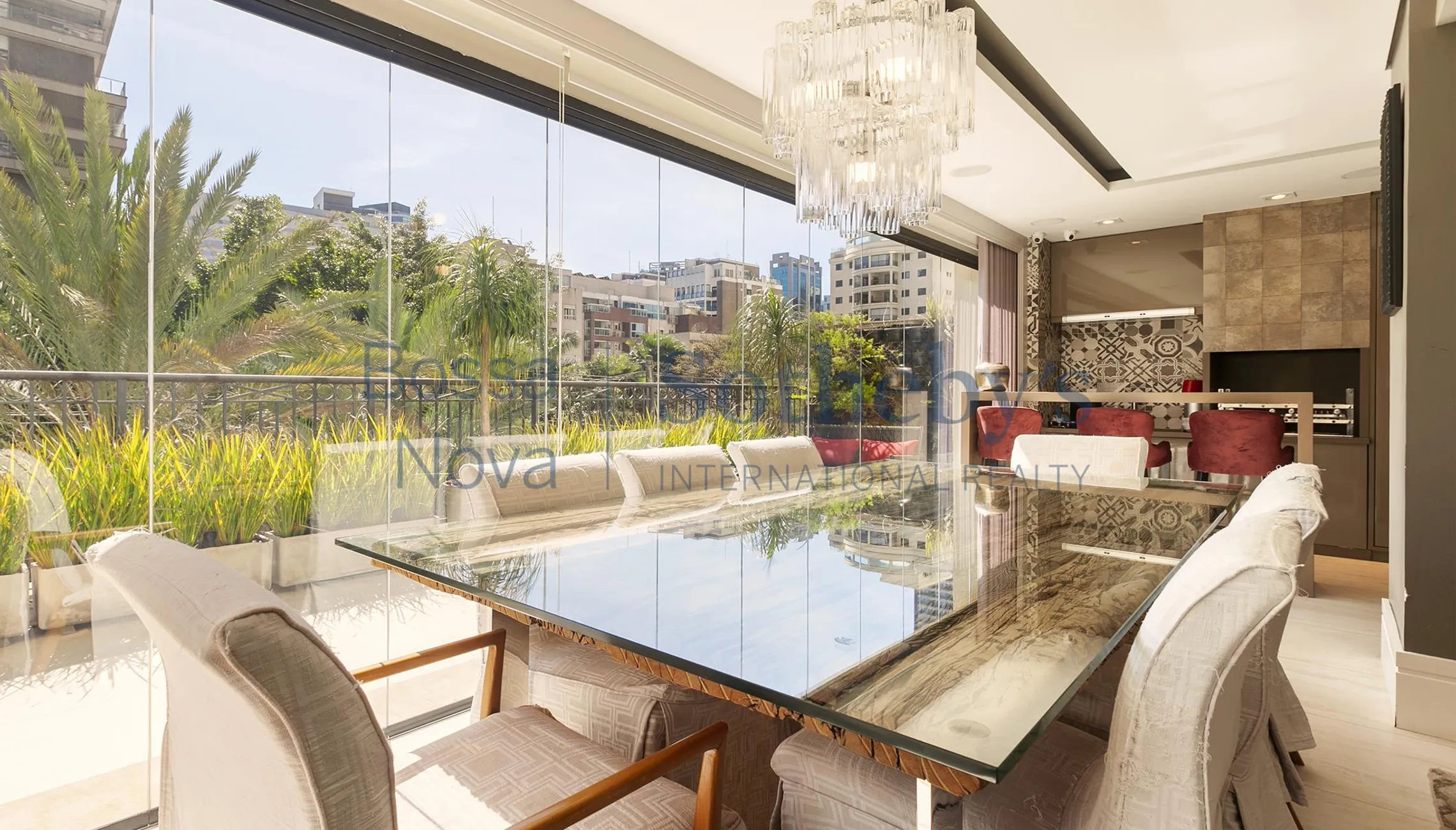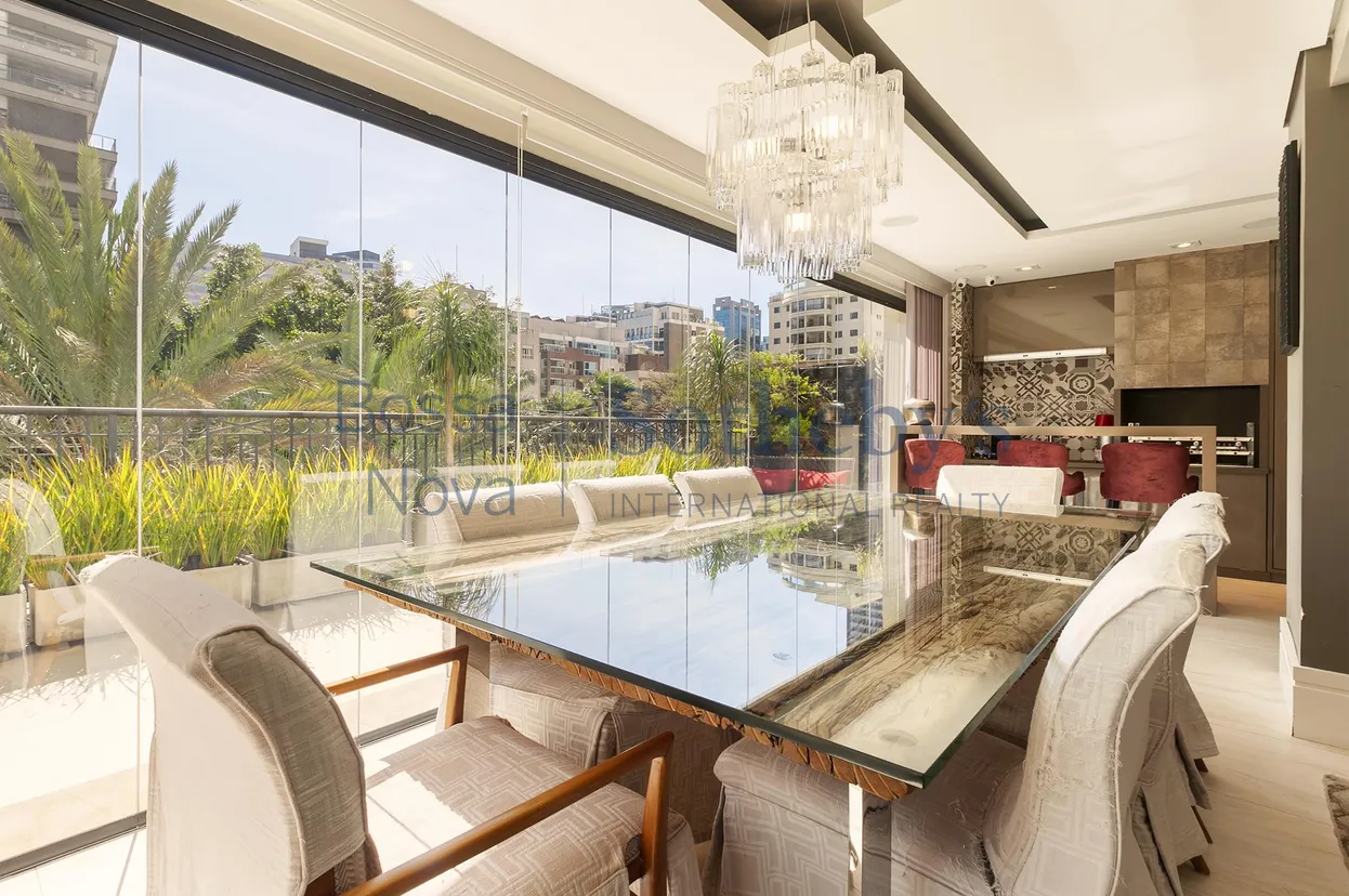 Apartamento com área externa e jardim com vista para a copa das árvores. Living para dois ambientes, sala de TV e sala de jantar integrada com a varanda gourmet, que se conecta com um enorme e agradável terraço garden. Possui churrasqueira e uma boa adega. Conta com lavabo e um escritório. Cozinha moderna e bem equipada com armários planejados. São quatro suítes, sendo a master com espaçoso closet. Todos os ambientes possuem ar condicionado. Área de serviço com banheiro de funcionária. São quatro vagas de garagem. Empreendimento com lazer completo, incluindo salão de festas e espaço gourmet, raia de 25 m, spa, brinquedoteca e uma excelente academia de ginástica com modernos equipamentos, perfeita para quem gosta de manter a rotina de exercícios sem sair de casa.