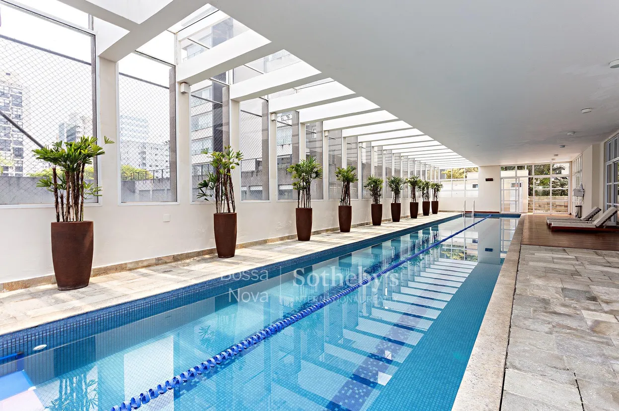 No pavimento inferior o living com pé direito duplo e janelas do chão ao teto trazem muita luminosidade, sofisticação e vista de tirar o fôlego integrando living, sala de jantar e jardim de inverno. Esse pavimento conta Esta cobertura reformada na Vila Olímpia é totalmente mobiliada e conta com marcenaria planejada e equipamentos selecionados. No pavimento inferior, o living com pé-direito duplo e grandes esquadrias favorece a entrada de luz natural e integra estar, jantar e jardim de inverno. Este nível abriga ainda três suítes, sendo a principal com closet para dois ambientes, além de copa, cozinha equipada e dependência destinada ao apoio. No piso superior, o home theater conecta-se ao espaço com adega climatizada e lareira, voltado para a área externa com piscina, spa, sauna e banheiro completo. Há também escritório e área de serviço. O imóvel possui cinco vagas e depósito. O condomínio oferece segurança e portaria vinte e quatro horas, salão de festas, piscinas coberta e externa, saunas, sala de massagem, quadras esportivas, brinquedoteca, playground, solário e vagas para visitantes.