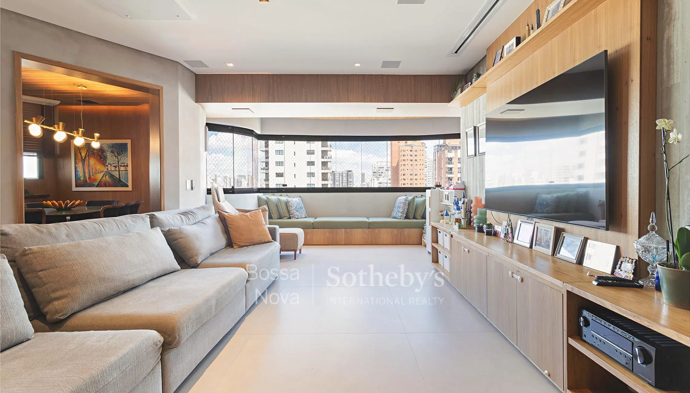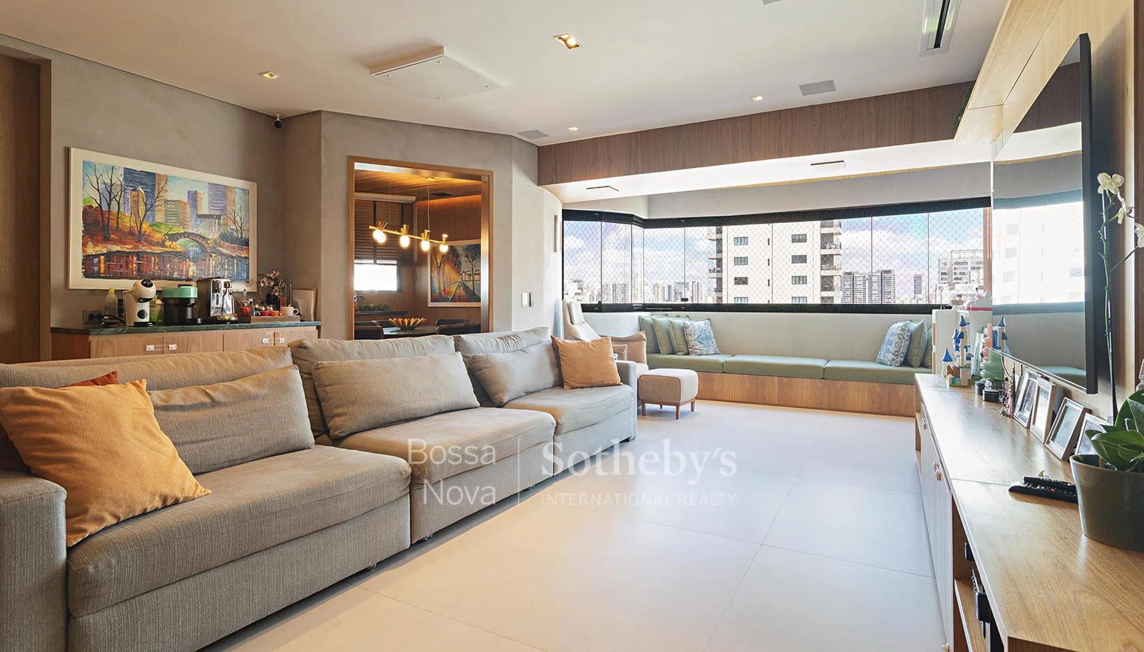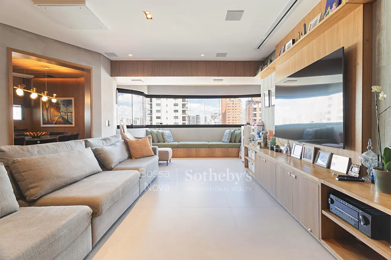 Localizado em Moema Pássaros, este apartamento em andar alto valoriza integração e conforto. A área social conta com living para três ambientes, sala de jantar, varanda envidraçada e cozinha aberta equipada, além de adega climatizada e lavabo. Na área íntima, são três suítes, sendo a master com closet. O projeto dispõe ainda de um escritório independente, ideal para trabalho ou estudo. Todos os ambientes contam com armários planejados, com piso em porcelanato na sala e madeira nos dormitórios. Área de serviço completa, quarto e banheiro para funcionários complementam a praticidade do imóvel. São três vagas de garagem, e o condomínio oferece piscina, academia de ginástica e quadra poliesportiva.